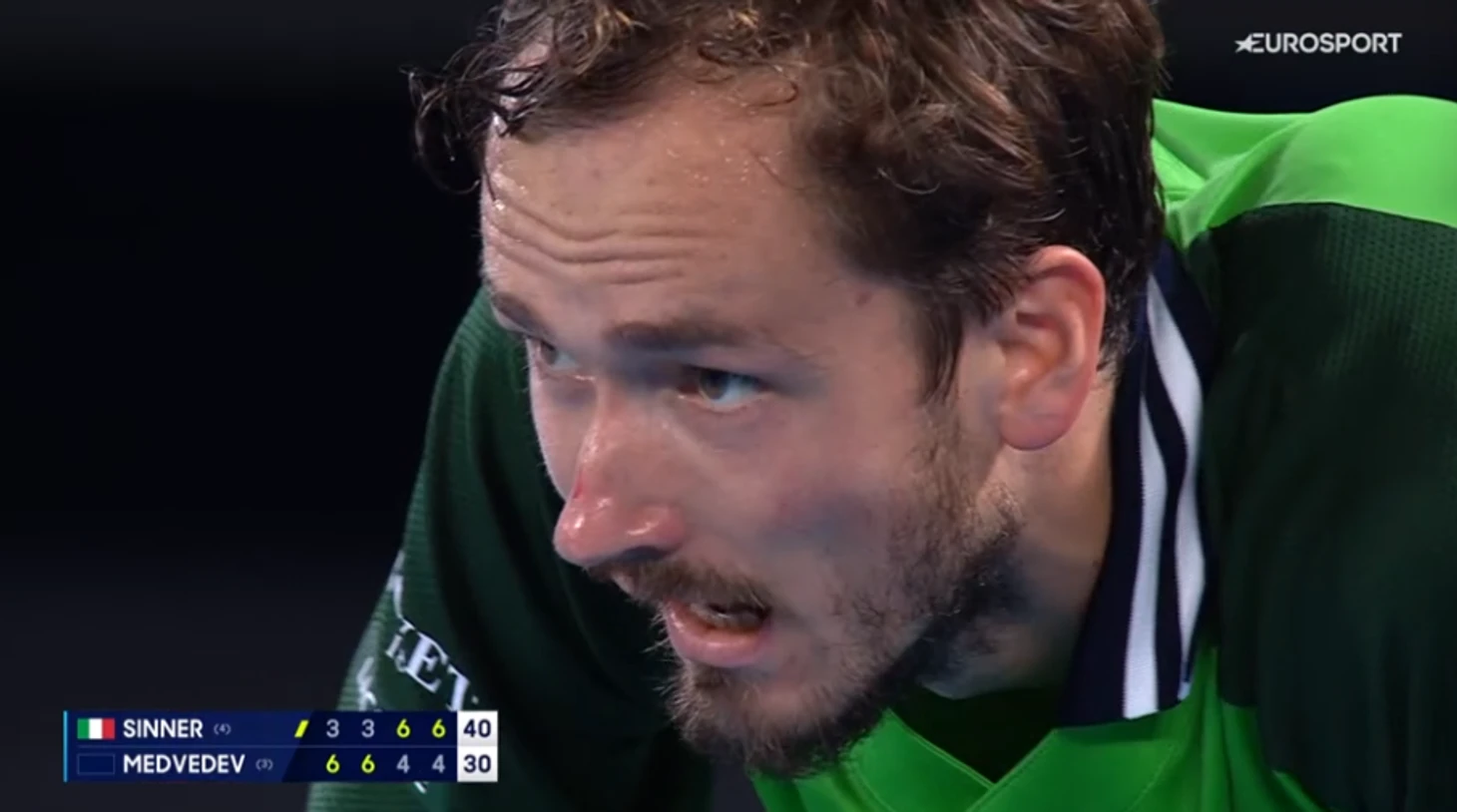 Медведеву в начале гейма капельку не повезло. Он миллиметры не попал с резаного форхенда в обороне. Если бы попал, Синнеру бы было очень тяжело.