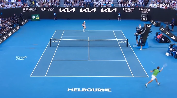 Кириос, кстати, ошибся. Медведев с первого же очка принимает близко к задней линии.