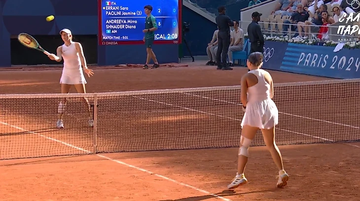 В воскресенье Мирра Андреева и Диана Шнайдер проиграли Саре Эррани и Жасмин Паолини в финале Олимпиады. Первыми в онлайне идут геймы россиянок, звездочкой отмечаются подающие.