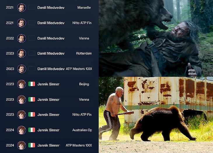 Но потом Янник переродился. Он стал мощнее, разнообразнее, подтянул подачу. Он превратился в первую ракетку мира, а в процессе обыграл Даниила пять раз подряд. Про это даже мем смешной есть.