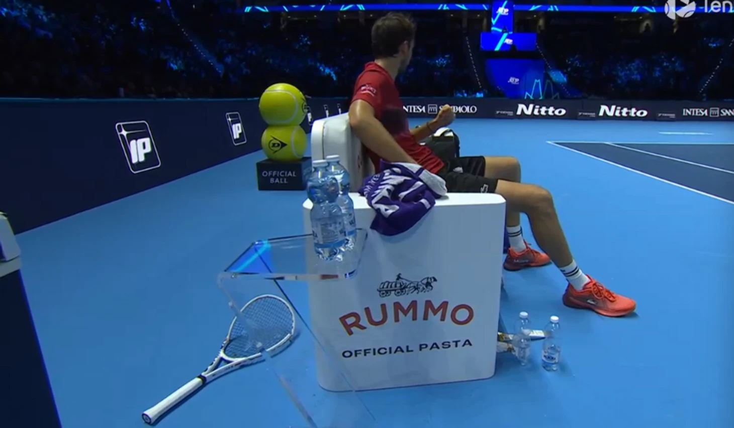 Проиграв подачу во втором сете, Даниил сначала кинул ракетку ввысь – но не сломал. Так что мог бы отделаться строгим взглядом от судьи. Но потом он ее поднял и вдарил по стоящему на корте микрофону.