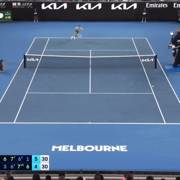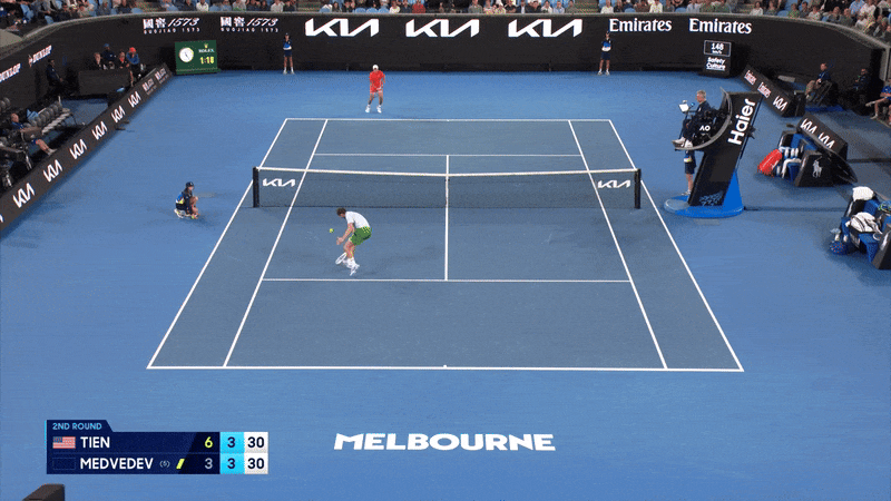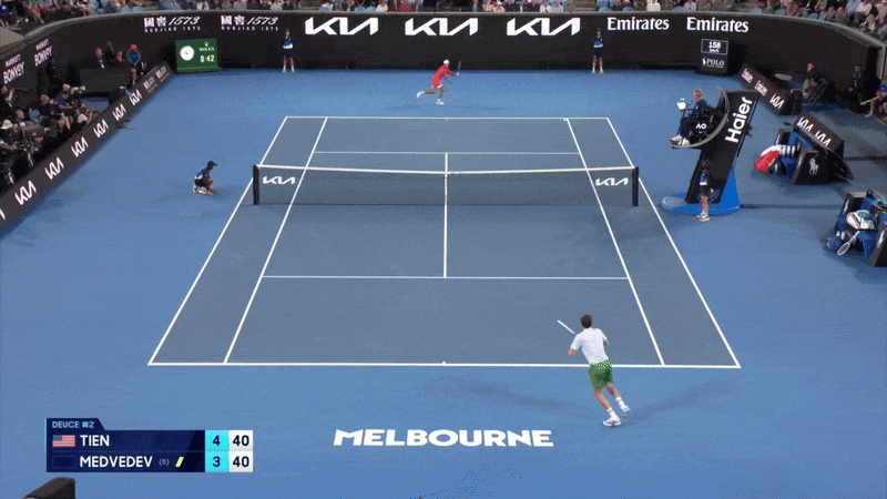 Медведеву приходилось очень стараться, чтобы держаться с ним наравне. Например, при счете 4:5 Тьен очень давил на приеме, но при счете 30:30 Медведев сначала выдал невероятный удар у сетки в ответ на классный прием Тьена – спиной вперед укоротил так, что Лернер даже не побежал.