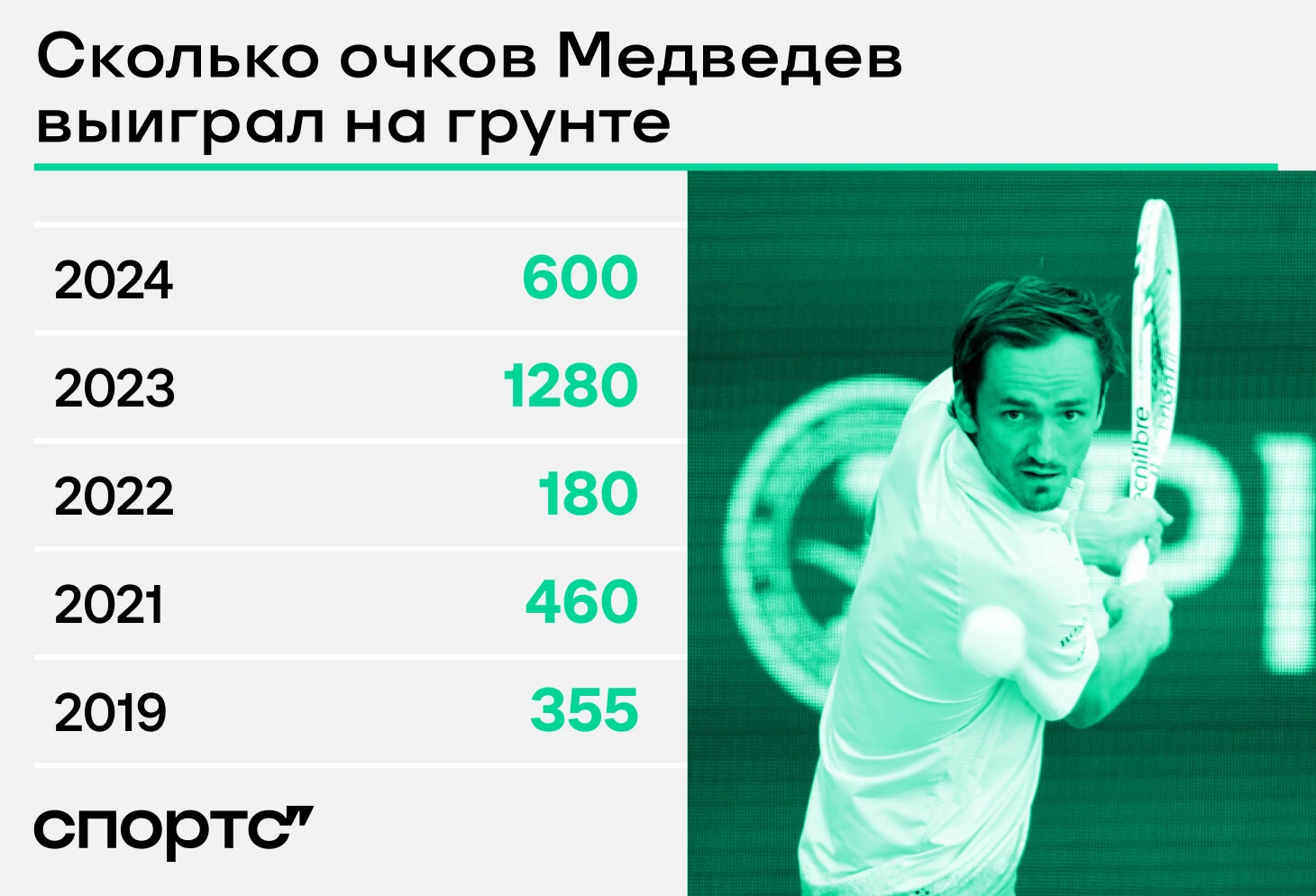 Сейчас такое маловероятно – потому что начинается грунт. На глине интересная ситуация. Если брать последние пять полноценных грунтовых сезонов (без ковидного 2020-го), то больше всего очков Медведев выиграл в последние два года.