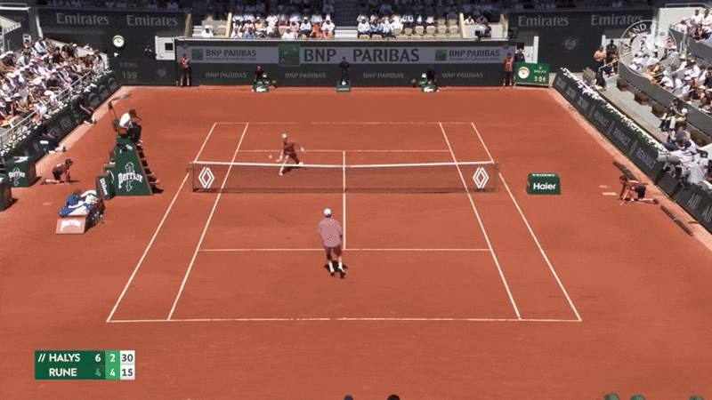В ответ на ультракосой укороченный соперника Руне пробежал весь корт по ширине и пропихнул мяч между сеткой и рекламным щитом.