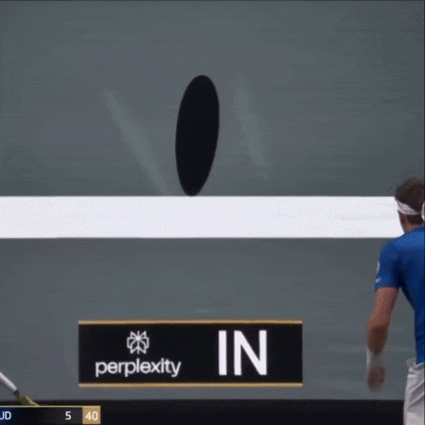 Эта подача в парном матче в третий день, видимо, зацепила линию ворсинками на мяче. Карлос и Каспер были шокированы.