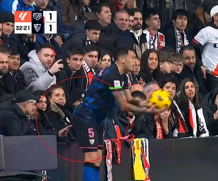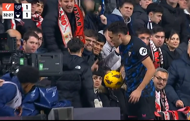 Вчера, необычный инцидент случился во время матча между Райо Вальекано и Севильей. Местный фанат, сидящий на первом ряду, воспользовался тем, что Лукас Окампос повернулся к нему спиной во время подачи аута и не придумал ничего лучше, чем ткнуть ему пальцем в задницу.