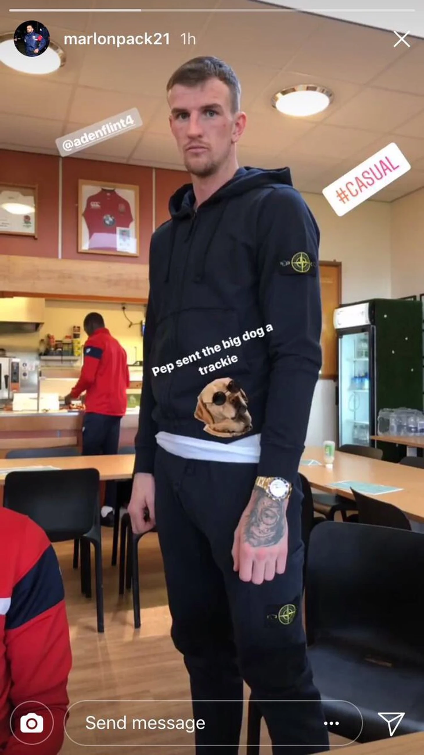 Но на этом история не закончилась. Сегодня одноклубник Флинта Марлон Пэк выложил в сториз инстаграма фото Эйдена в новом спортивном костюме Stone Island. Это подарок от Гвардиолы. На официальном сайте Stone Island олимпийка стоит 312 евро, а штаны – 228.