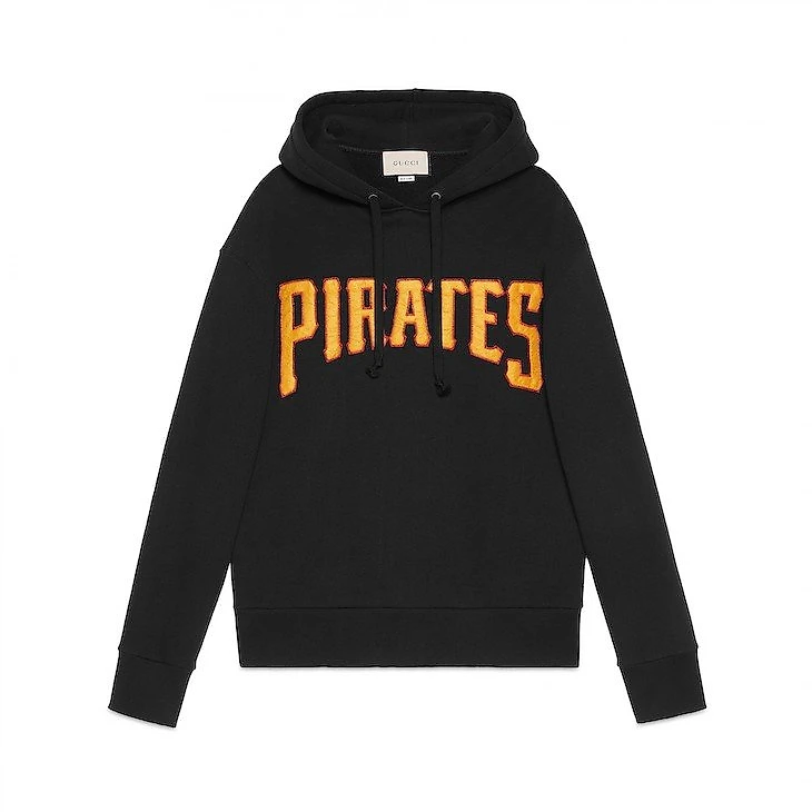 Это коллаб итальянского бренда с MLB, главной бейсбольной лигой США. На спине – огромное лого Gucci, на груди – лого бейсбольной команды Pittsburgh Pirates.