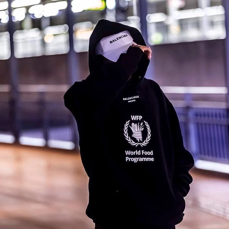 Худи выпущена в благотворительной коллаборации с Всемирной продовольственной программой (World Food Programme). Это гуманитарная организация в структуре ООН, цель которой – борьба с голодом по всему миру. На груди – логотип World Food Programme, на спине – надпись Saving Lives Changing Lives («Спасаем жизни, меняем жизни»).