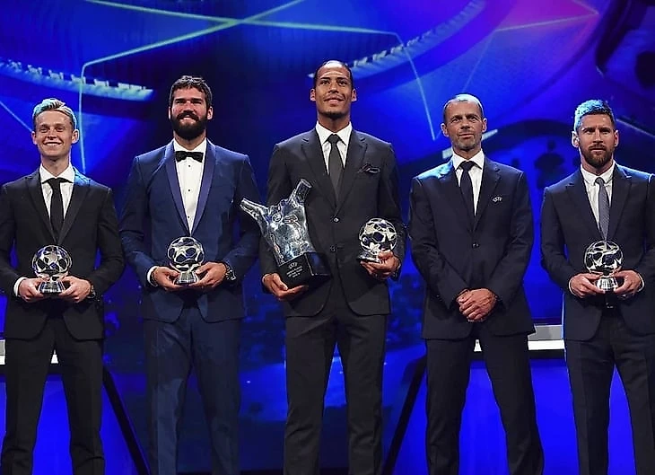 Ничего близкого по эпичности в этот вечер уже не было, но премии УЕФА раздала. Слева направо: лучший полузащитник ЛЧ-2018/19 Френки де Йонг, лучший вратарь Алиссон, лучший игрок ван Дейк, президент УЕФА Александр Чеферин, лучший нападающий Лео Месси.