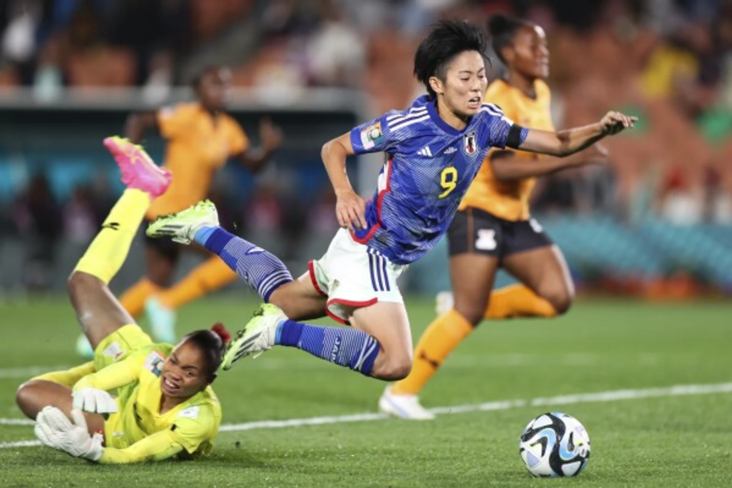 Игра снова прошла в одну калитку. На 21-ой минуте Мина Танака открыла счёт, но во время подачи со штрафного она находилась в офсайде, так что гол отменили по-настоящему открыла счёт Хината Миядзава на 43-ей минуте. В начале второго тайма ещё один гол Танаки был отменён – снова из-за офсайда. На 51-ой минуте Мусонда срубает в своей штрафной Аобу Фудзино, но пенальти не был назначен из-за всё того же офсайда (жёлтая карточка у вратаря осталась). Через пару минут Танака всё-таки забила в пределах правил. Миядзава оформила дубль, а Дзюн Эндо забила четвёртый гол. На 97-ой минуте Мусонда снова сбивает в штрафной, на сей раз, Рико Уеки и отправляется досматривать матч из раздевалки. Заменившая её Энис Сакала парировала удар Уеки, но Олофссон потребовала перебить пенальти из-за нарушения правил со стороны Сакалы (вышла за линию во время удара). Со второй попытки Рико забила.