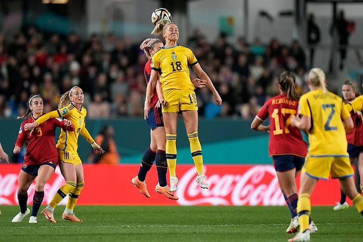 У Шведок Лина Хуртиг было первое касание после замены и сразу головой пас на так же вышедшую на замену перед голом испанок Блумквист.