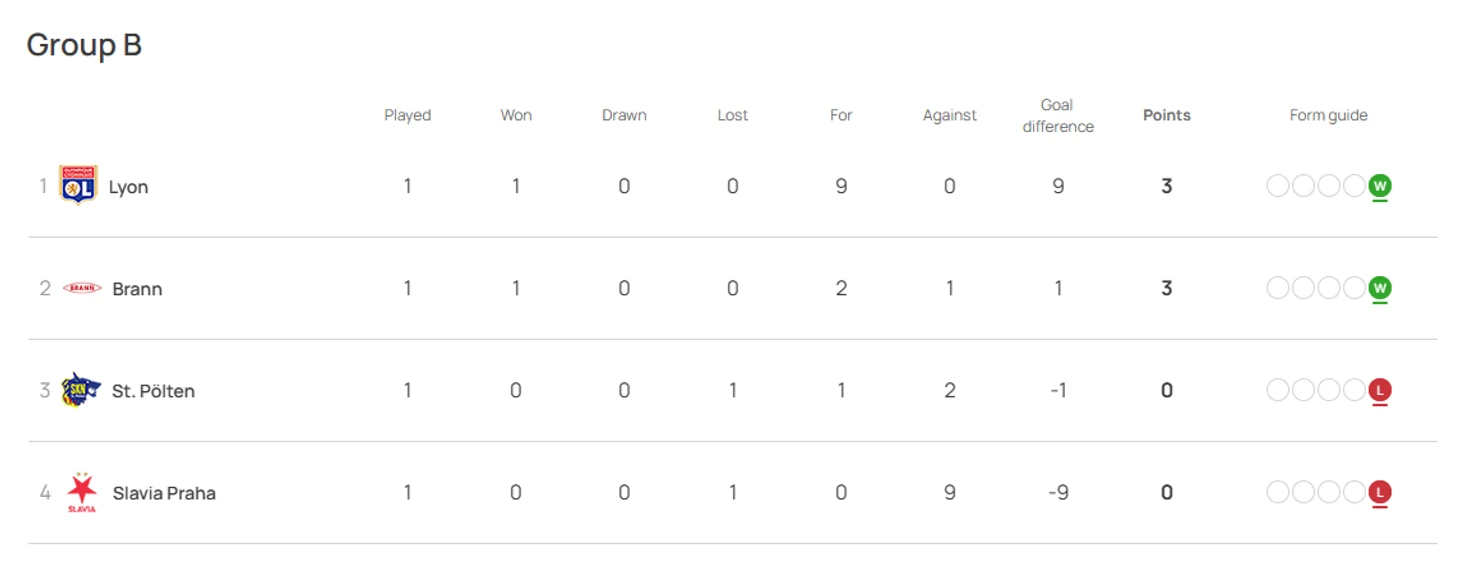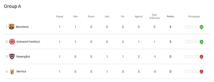 Положения в группах после первого тура женской Лиги чемпионов 2023/24: