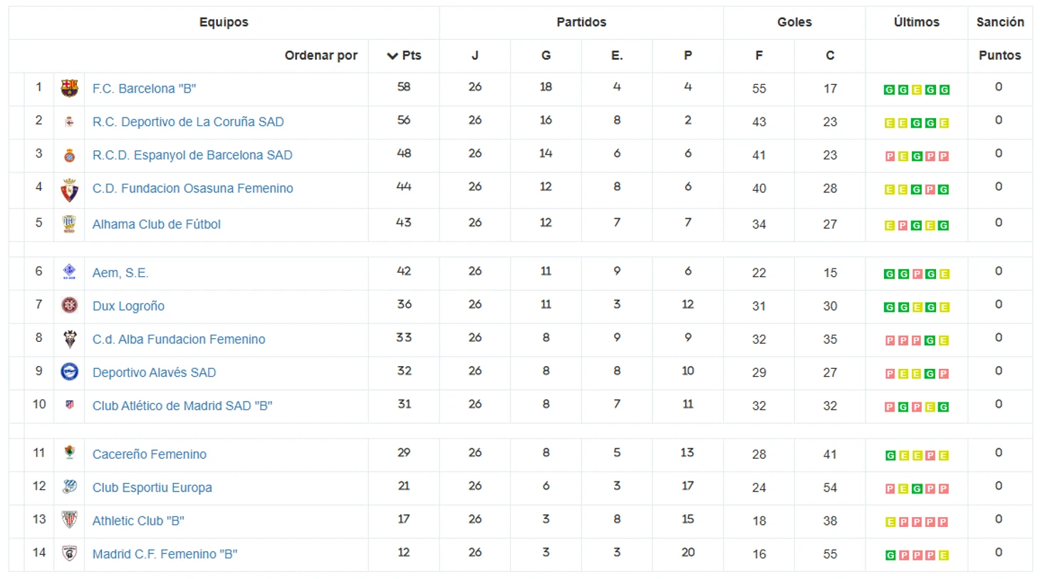 «Барселона» доминирует даже здесь. Старт был неудачным – две победы и три поражения в первых пяти турах, но «блауграна» поправила ситуацию. В последний раз каталонки уступили 17 декабря. Чемпионство было оформлено в последнем туре. «Сине-гранатовые» закончили сезон, набрав на одно очко меньше, чем в прошлом. Было бы интересно посмотреть на «Барсу Б» в элите.