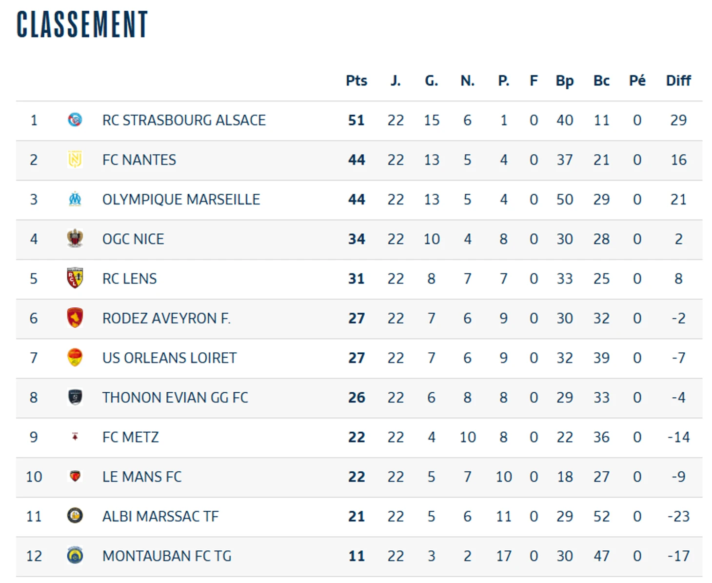 Борьба за вторую путёвку шла до последнего тура. «Нант» и «Марсель» закончили сезон с 44 очками, но «канарейки» заняли второе место за счёт двух побед над прямым конкурентом (1:0 и 3:2). «Южанам» не хватило усилий Эшли Кларк и Мамы Диоп, забивших 21 гол на двоих. Для «Нанта» это первый выход в элитный дивизион.