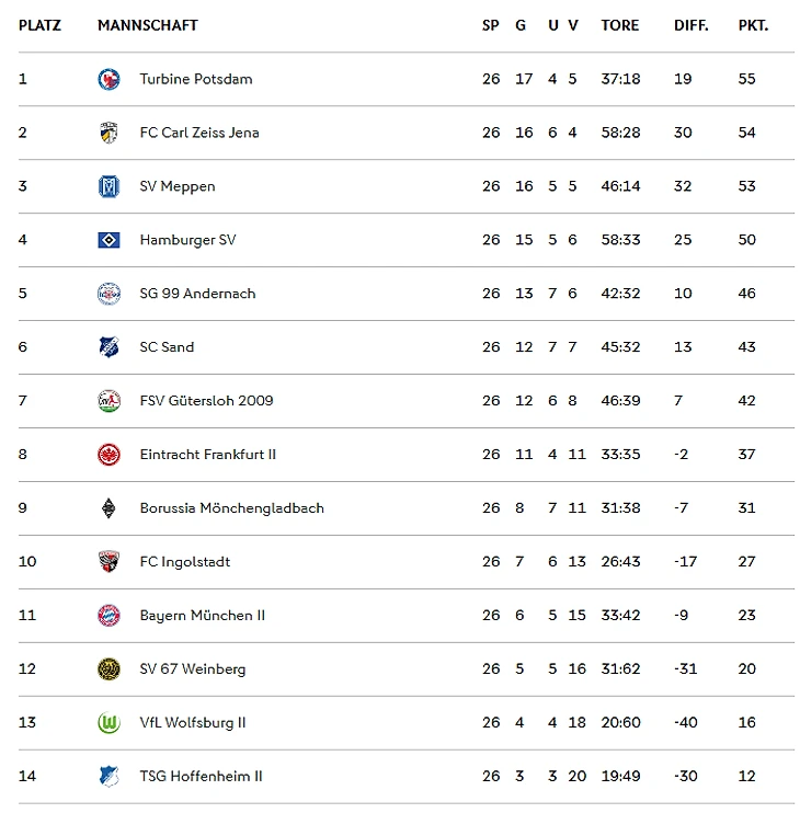 По итогам сезона 2022/23 во вторую женскую Бундеслигу упали «Меппен» и «Турбине». Клуб из Потсдама 6 раз побеждал в чемпионате и дважды – Лиге чемпионов (в 2005-м и 2010-м). Во втором дивизионе он не выступал с 1994 года. В своё время за «Турбине» играли Ада Хегерберг, Аня Миттаг, Ирина Григорьева, Мари-Луиз Эта (первая в истории ассистентка в мужской Бундеслиге) и много других известных футболисток. Из Региональной лиги поднялись «Вайнберг», «Боруссия» Мёнхенгладбах и «Гамбург».