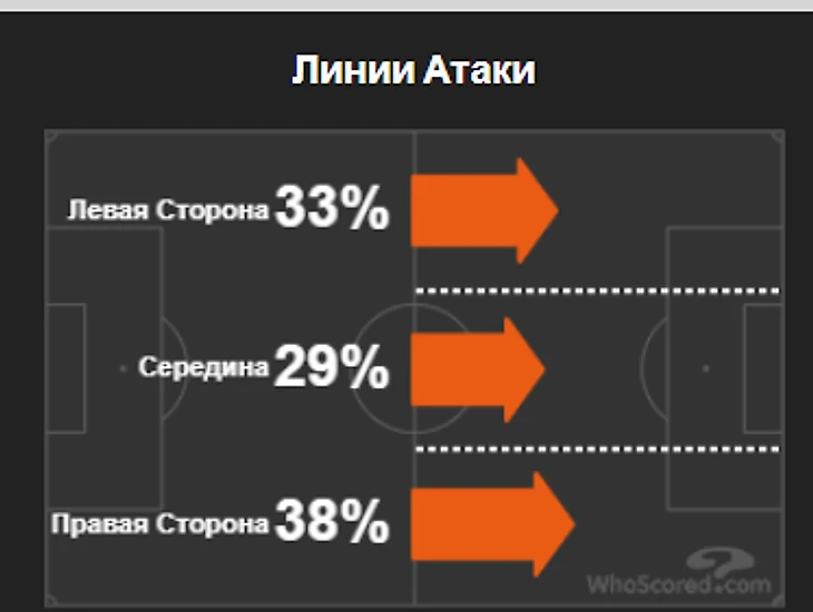 "Красно-желтые" любят атаковать флангами в этмо сезоне. Атак через центр у них поменьше, что видно на графике.