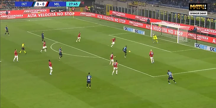 Перишич здорово пробежал по флангу, совершив опасный прострел, но Тео вынес мяч за пределы штрафной. Там не оказалось никого из красно-черных. Мяч подхватил Брозович, которого пытался накрыть Кессе. Попыток было мало, хорват убрал ивуарийца и ударил. Мяч, срикошетив от Калулу, чуть не попал в ворота. Благо Майк все видел и отразил удар.