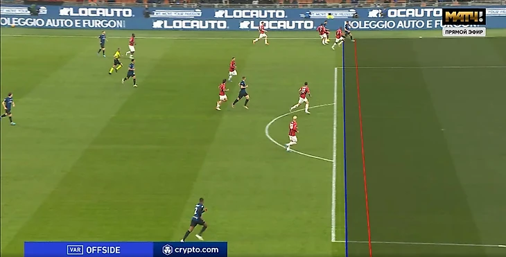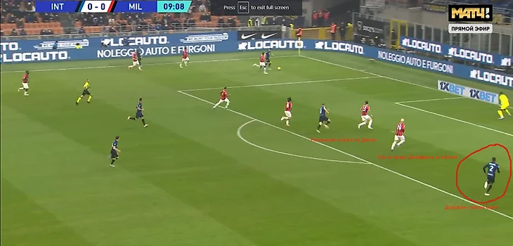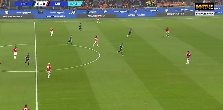 "Нерадзурри" тоже старались затруднять розыгрыш мяча своим визави. Лаутаро играл по Калюлю, Джеко с Романьоли, по Тонали двигался Брозович, а с Хаканом был Беннасер. Обратите внимание на позицию Тео и Леао. Тео намеренно уходил в центр в таких ситуациях, чтобы дать свободу на фланге Леао, который мог бы на пространстве обыграть Дамфриса.