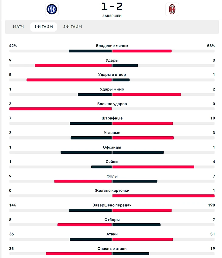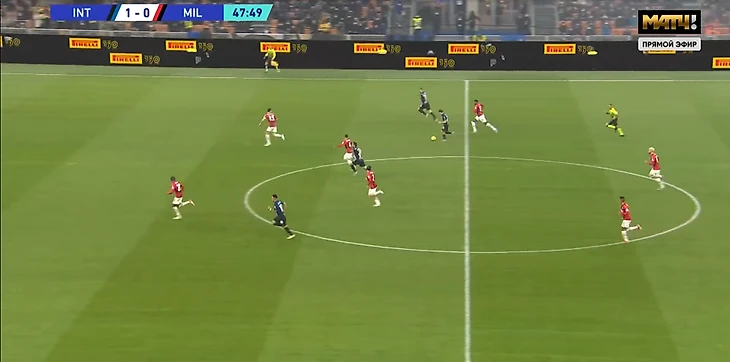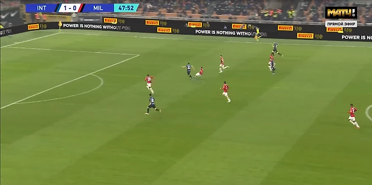 "Интер" же переходил с помощью розыгрышей мяча через Хакана или через рывки Перешича и Дюмфриса. С первых минут на правой бровке закипела борьба, Дюмфрис и Тео не щадили друг друга, что длилось на протяжении всего матча.