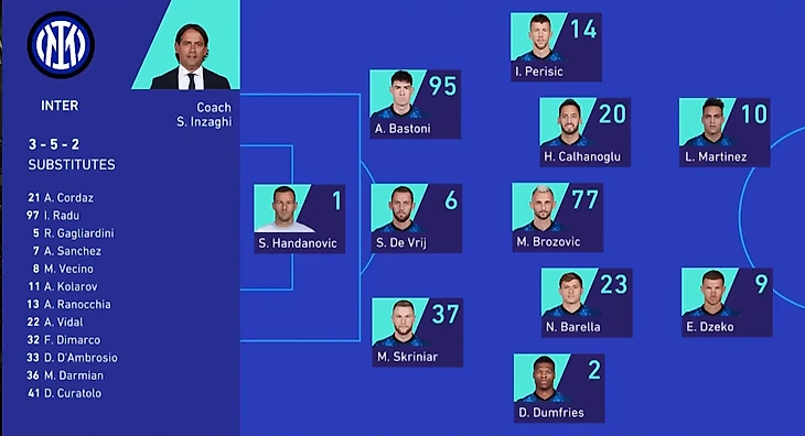 На 69 минуте, за 20 минут до конца, тренер "Интера" совершил двойную рокировку. Вместо Лаутаро вышел Санчес, вместо Перишича Димарко. Как оказалось, оба выхода были неудачными. Димарко получил всего 6.0, Санчес самую низкую оценку вечера - 5.7. Спустя три минуты вышел Видаль вместо Чалханоглу. Чилиец тоже получил всего 6.0.