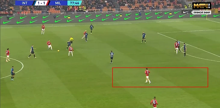 Интересным выглядело построение "россонери" при затяжных атаках. Build up складывался так, что Тео стал играть шире. Калюлю тоже ушел во фланг, Калабрия поднялся в центр поля, а помогал разырывать мяч Романьоли Беннасер.