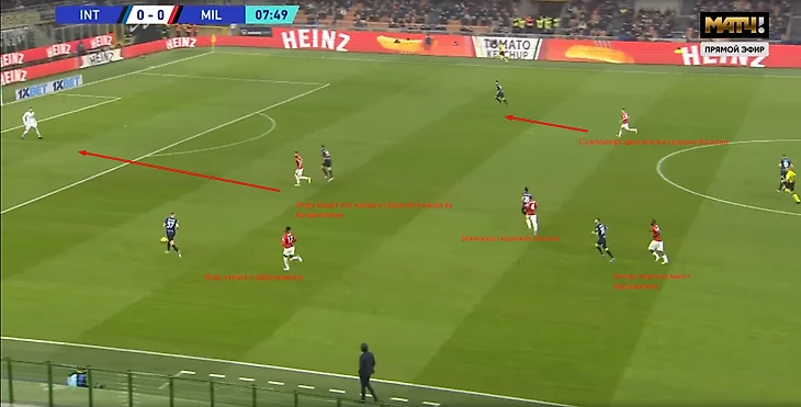Все началось с привычного высокого прессинга "россонери". Вблизи штрафной оказалось целых 5 игроков в красно-черной форме. Ханданович просто вынес мяч вперед, но там тоже только Романьоли и Беннасер.