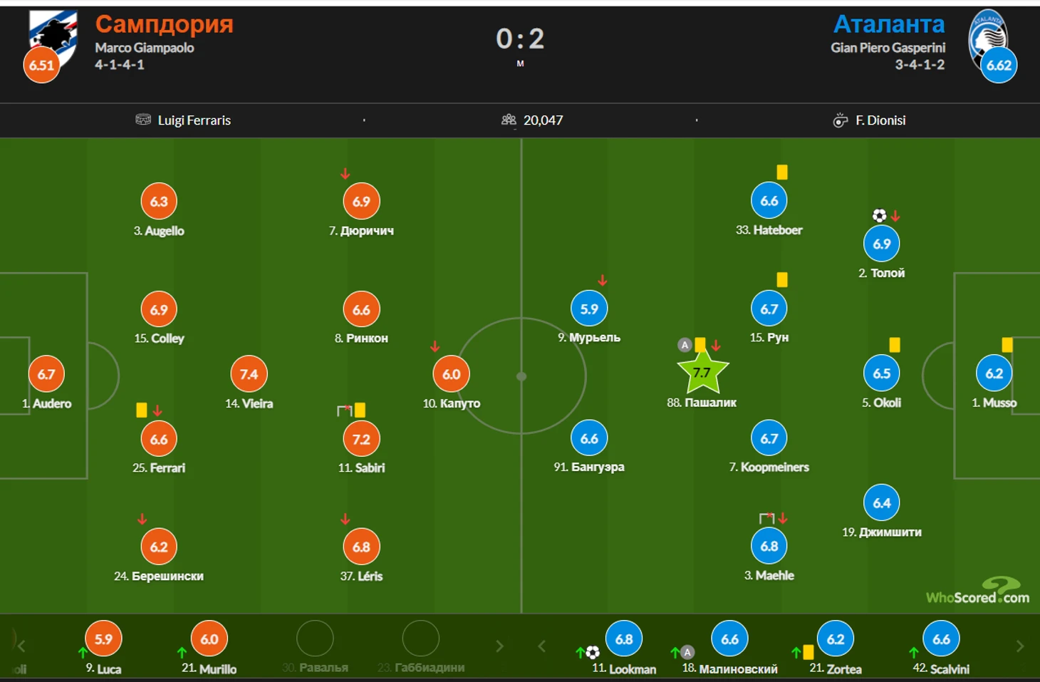 У Сампдории были моменты сравнять счет, но штанга и перекладина — подруги Муссо, играли за гостей. Второй мяч был забит после резкой контратаки. Мяч подхватил Малиновский, вышедший во втором тайме, протащил до чужой штрафной, отдал пас на свежего Лукмана и тот, разобравшись с Колли, забил свой дебютный мяч за Аталанту.