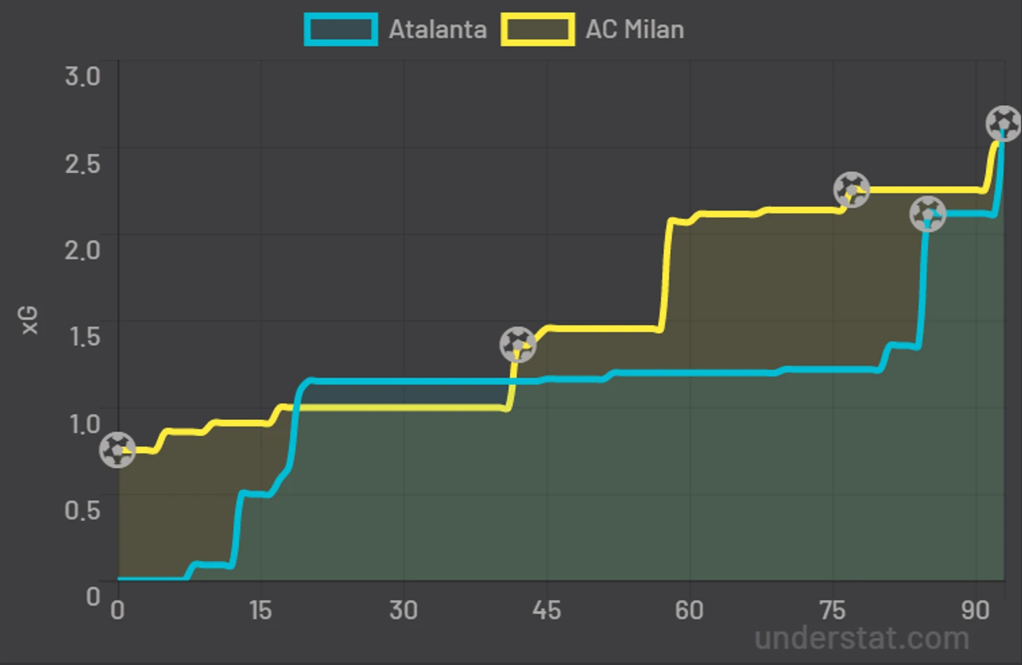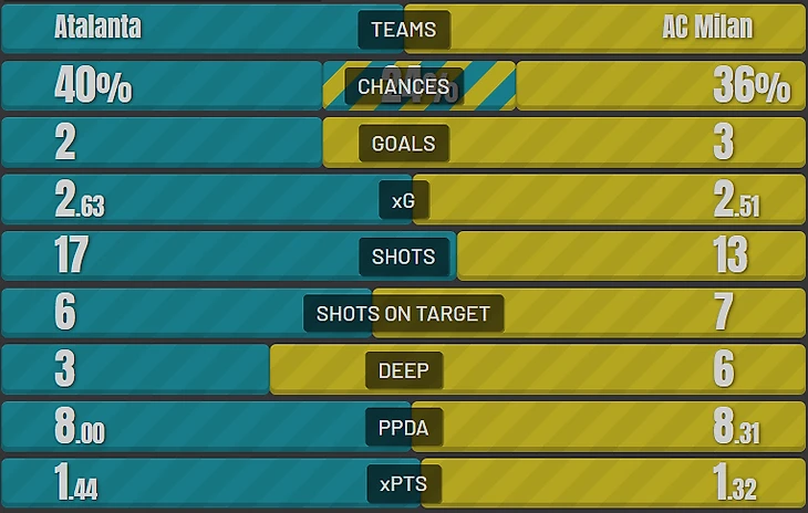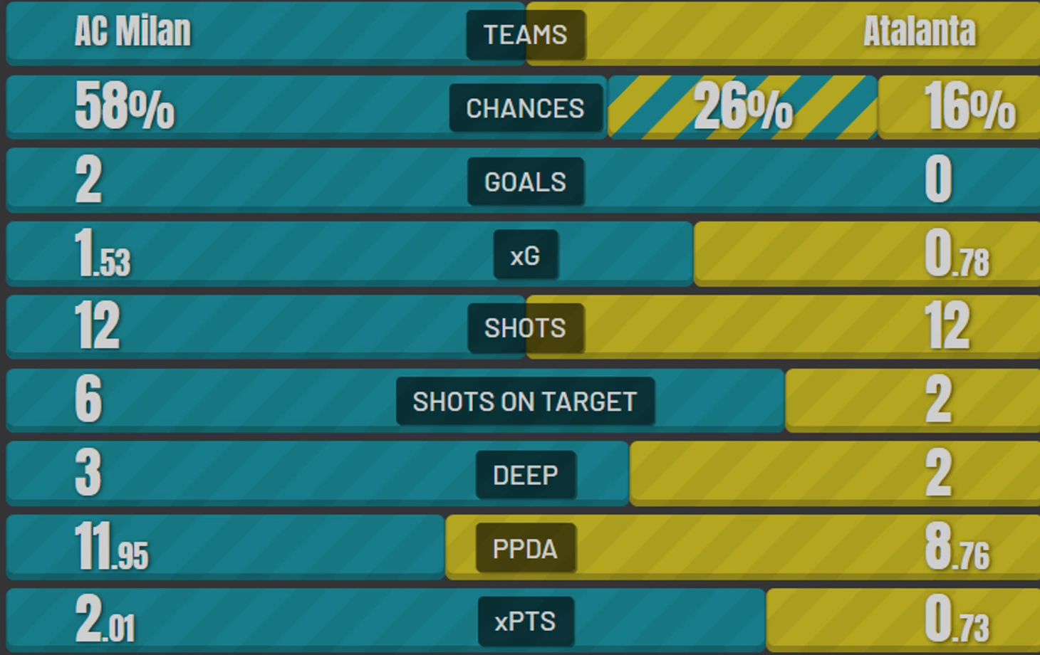 По статистике Милан, якобы, не наиграл на победу, но кто помнит матч, тот усомнится в метрике XG и XPTS. Милан умело сыграл от обороны и ранил соперника тремя кинжальными выпадами. И это показывает временная метрика. На промежутке с 45 минуты до 75 Милан был ощутимо лучше, и только в конце хозяева смогли нагнать, в том числе и из-за пенальти на последних минутах.