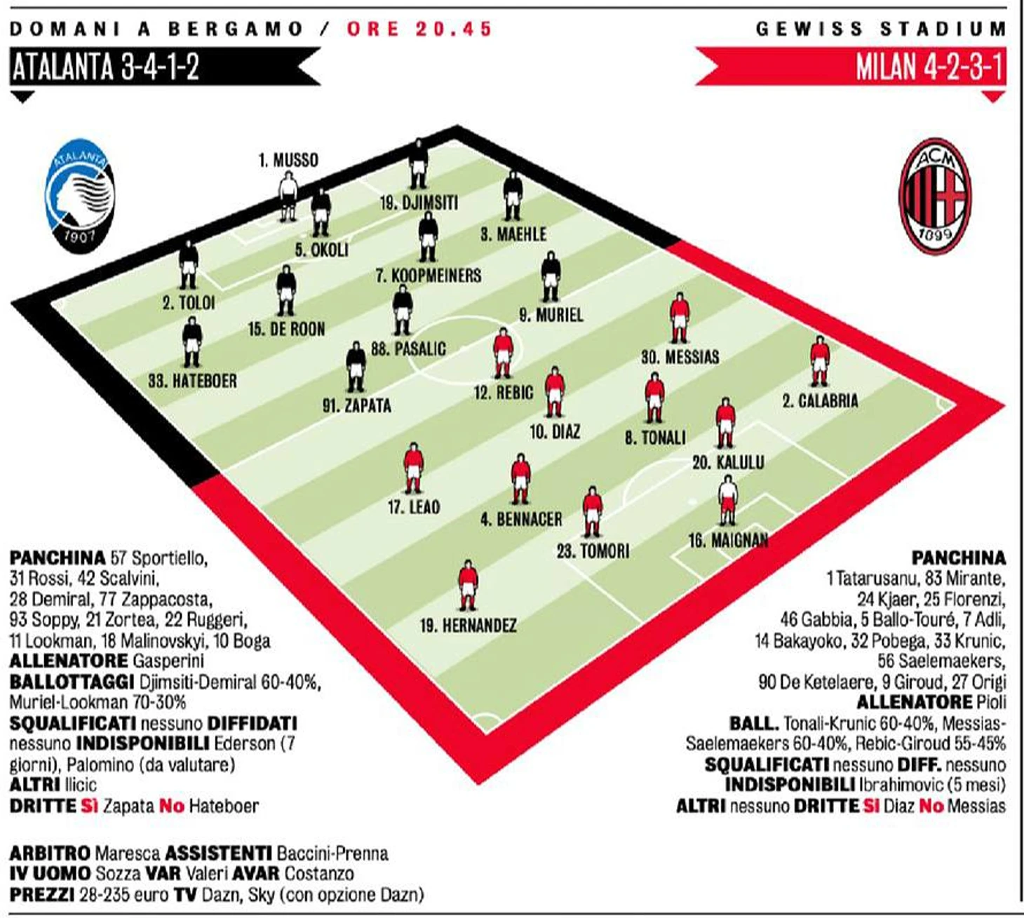 В кои-то веки в Милан Лаб пусто. Сандро Тонали выздоровел и выйдет в основе. Падре Пиоли может расчитывать на всех игроков, что не может не радовать. И даже есть приятная головная боль — кого выпускать в старте? Тут и Ребич в прекрасной форме, и выздоровевший Жиру, и готовый к подвигам Ориги. Справа тоже дилемма — Мессиас или Салемакерс? У Аталанты с травмами дело похуже. Против Милана не поможет Эдерсон, нападающий Кабесас и полузащитник Муратори. Под вопросом выход Демираля, Дзаппакосты. GdS рисует следующие стартовые составы: