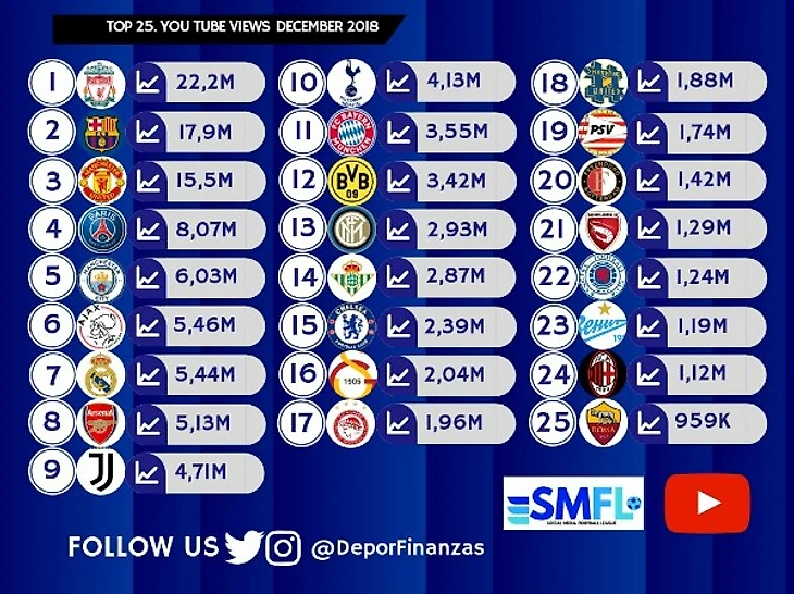 Топ-25 самых популярных (по просмотрам) футбольных клубов в ютубе в декабре 2018 года. «Хэштег» на 18-м месте, обратите внимание, кого он обогнал.