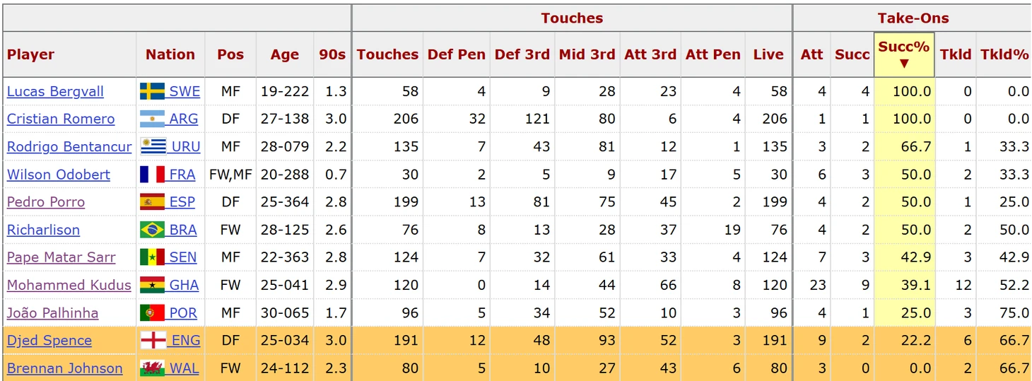 Бреннан Джонсон - атакующий игрок Тоттенхэма, который меньше всех шел в обводку в прошлом сезоне (1,82 попытки дриблинга за 90 минут). В этом сезоне - все также, 3 обводки, ни одной успешной. Каждый раз, когда Джонсон остается 1в1 с крайним защитником - он ждет забегания Спенса. А после отдает пас не в такт, не в ногу, в аут. Если говорить кратко - полная противоположность Кудуса. Это во многом объясняет серьезный интерес к Савиньо этим летом, который по слухам должен возобновиться зимой.