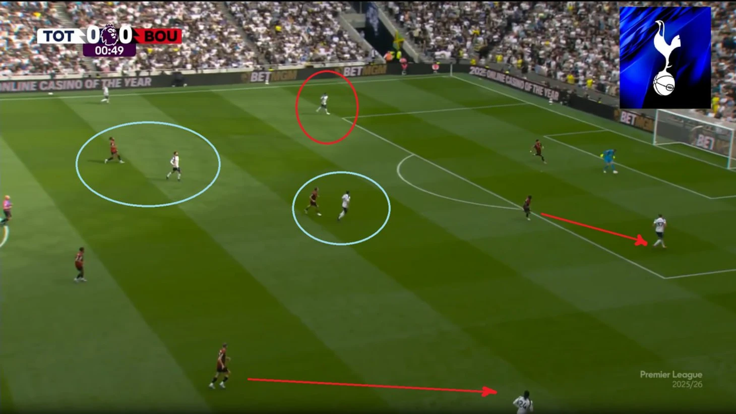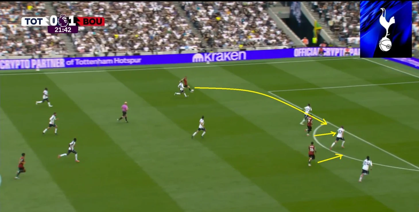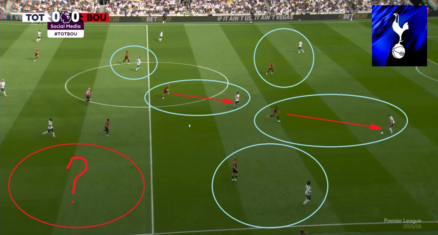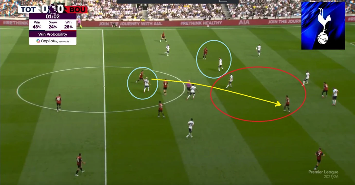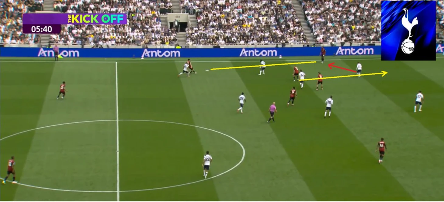 Тавернье стоит в опорной зоне Тоттенхэма совершенно один, Сенеси делает передачу между Сарром и Палиньей. При этом Жоао мяч не перехватывает и потенциально оставляет игрока соперника без опеки в самой опасной зоне поля, и вот Борнмут уже готов разбегаться. Повезло, что Тавернье отвратительно принял мяч, и Микки смог перевести его на Бентанкура.