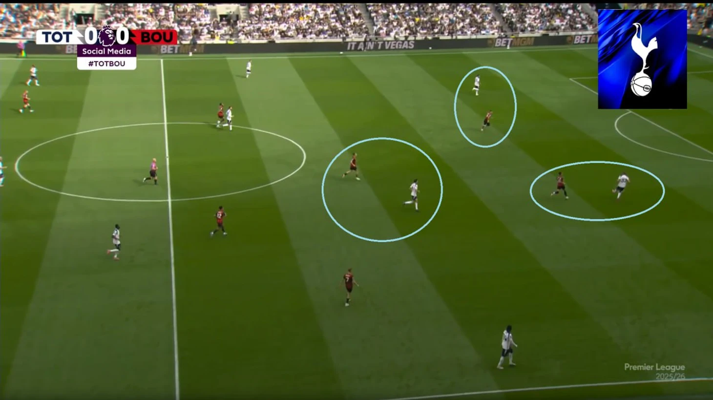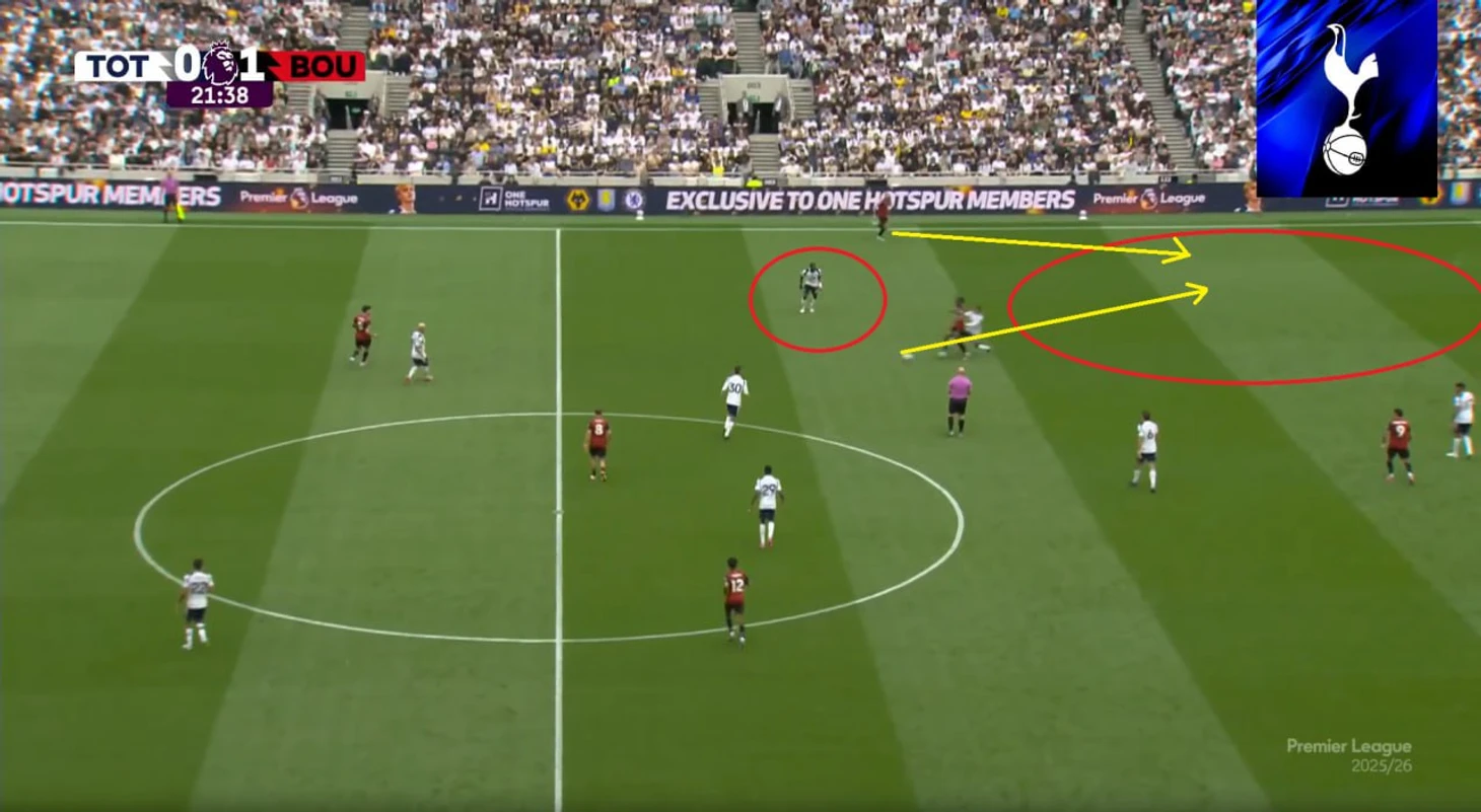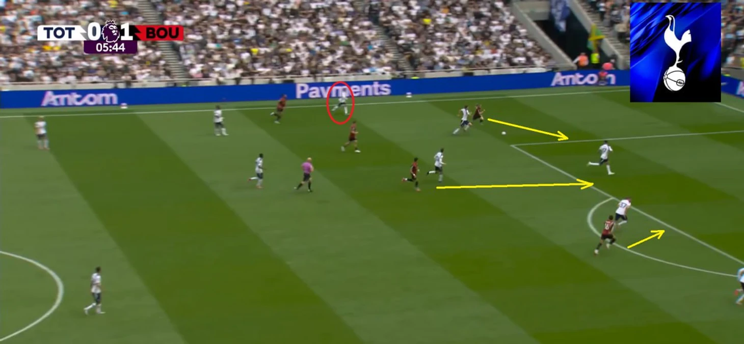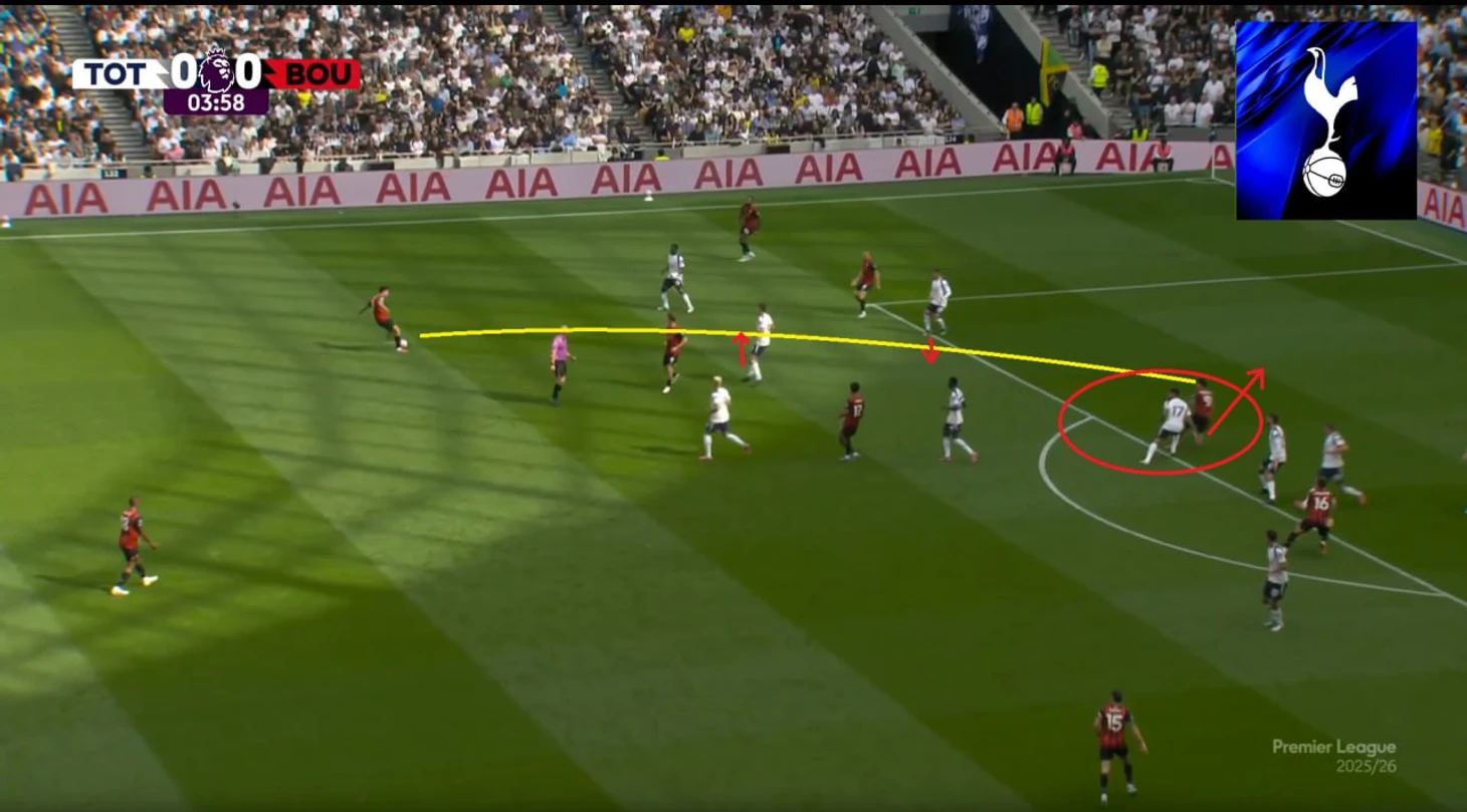 Тавернье стоит в опорной зоне Тоттенхэма совершенно один, Сенеси делает передачу между Сарром и Палиньей. При этом Жоао мяч не перехватывает и потенциально оставляет игрока соперника без опеки в самой опасной зоне поля, и вот Борнмут уже готов разбегаться. Повезло, что Тавернье отвратительно принял мяч, и Микки смог перевести его на Бентанкура.
