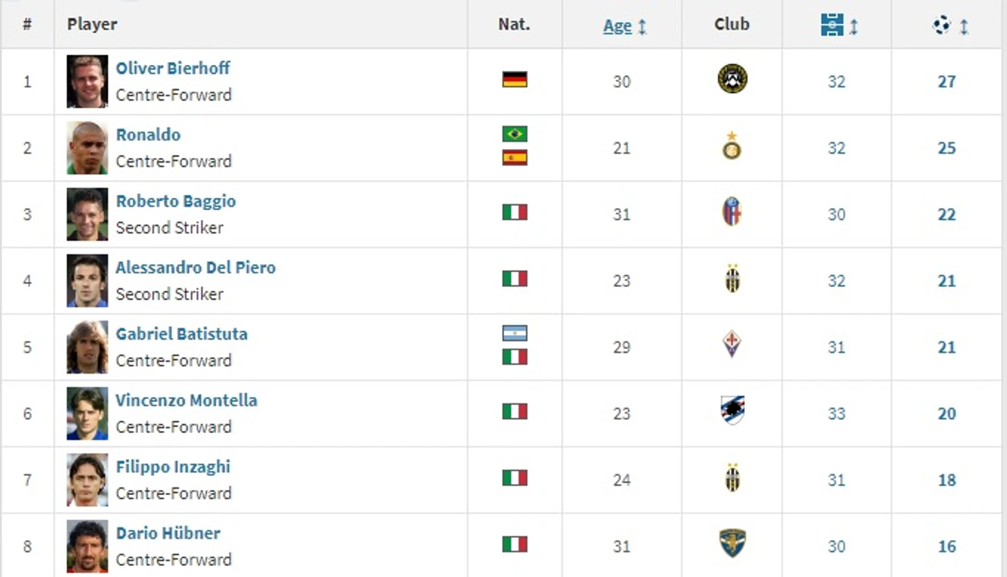 А кто же был первым? Спорим, вы не сразу вспомнили этого человека? Оливер Бирхофф, скромный герой провинциального клуба «Удинезе», который благодаря 27 мячам немца выскочил на третье место, обогнав целую россыпь более богатых и грозных соперников.