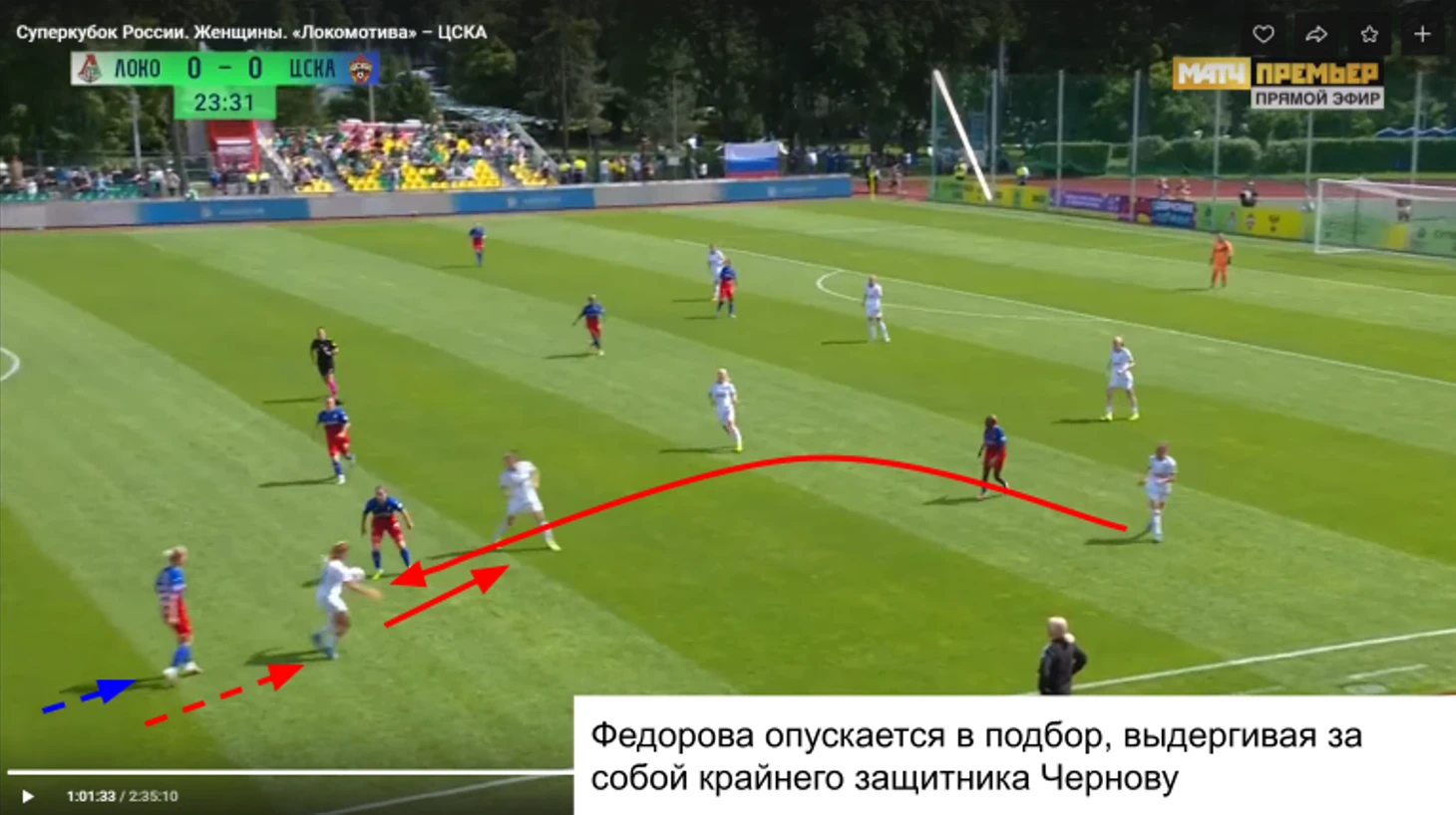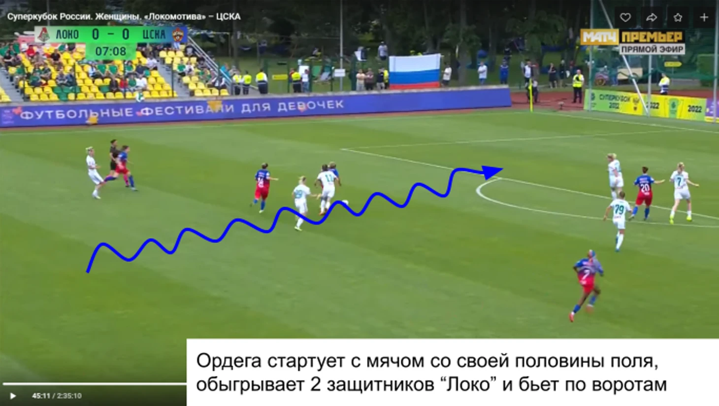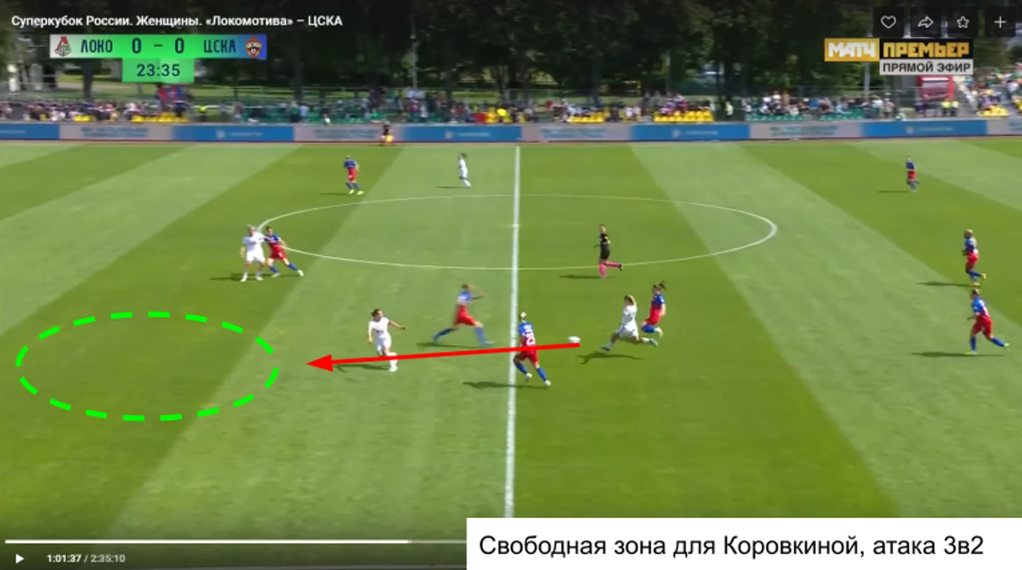 Тут нельзя не отметить великолепную обводящую передачу от Хорошевой, которая до удаления оказывала большое влияние на атаку «Локо».