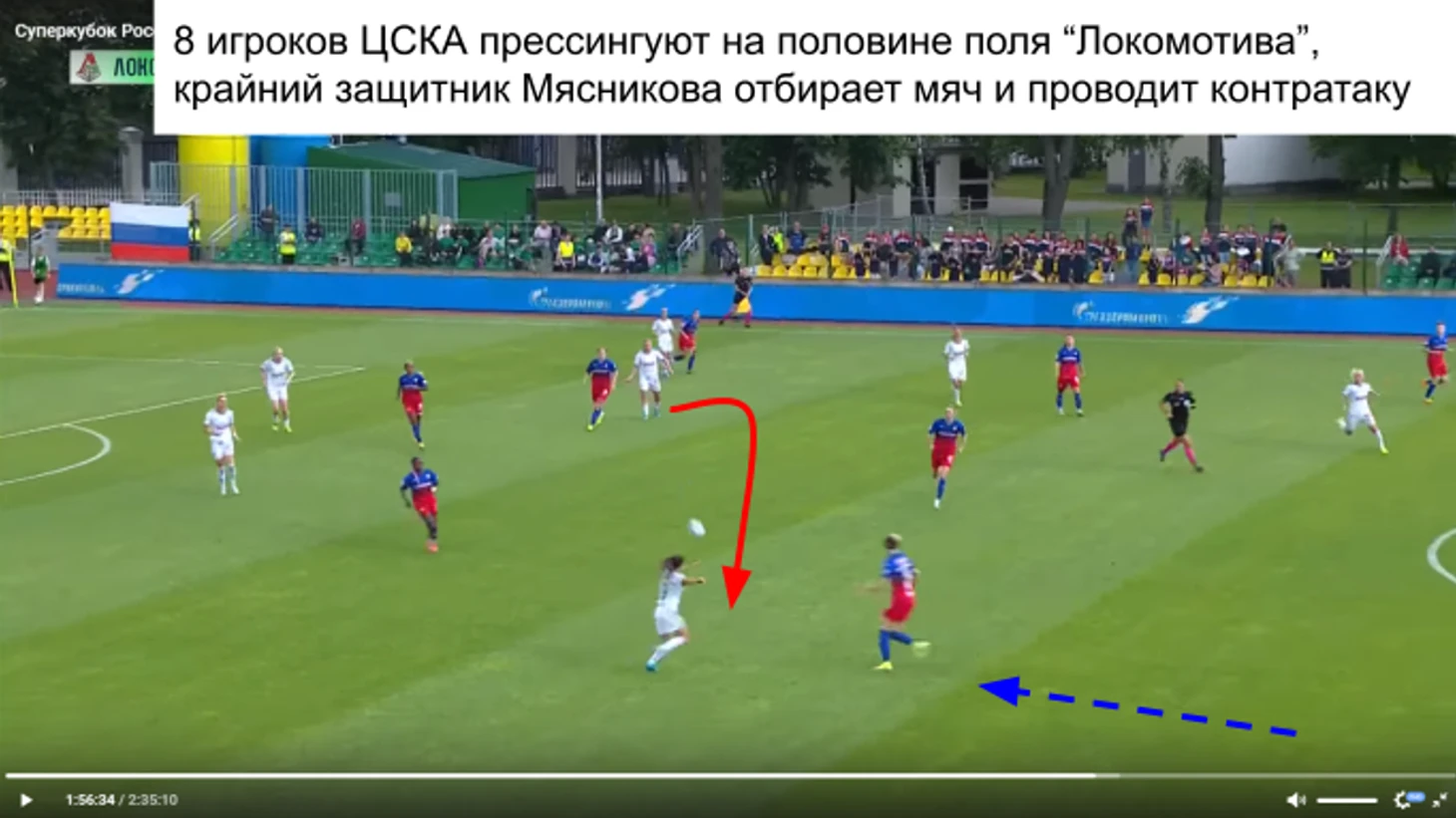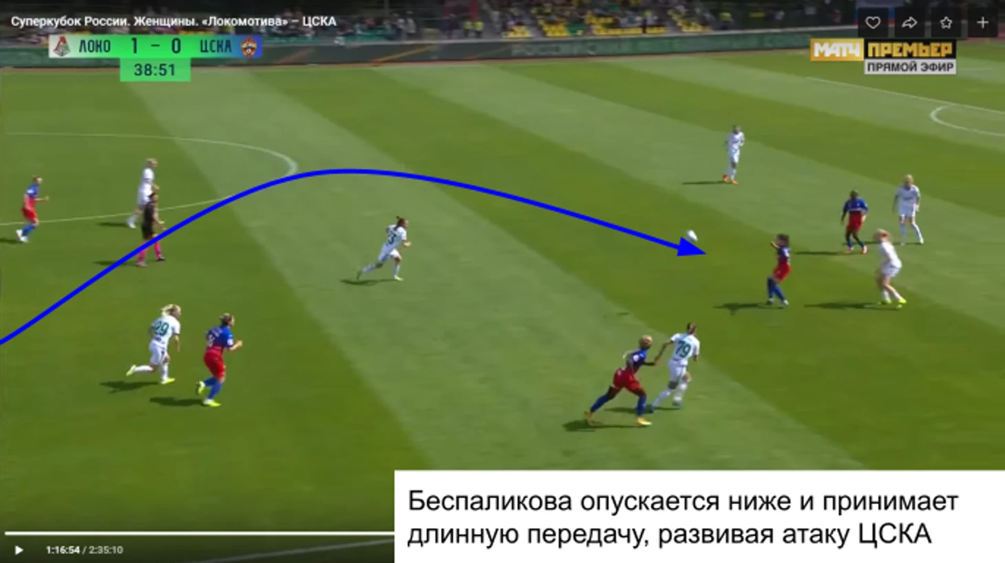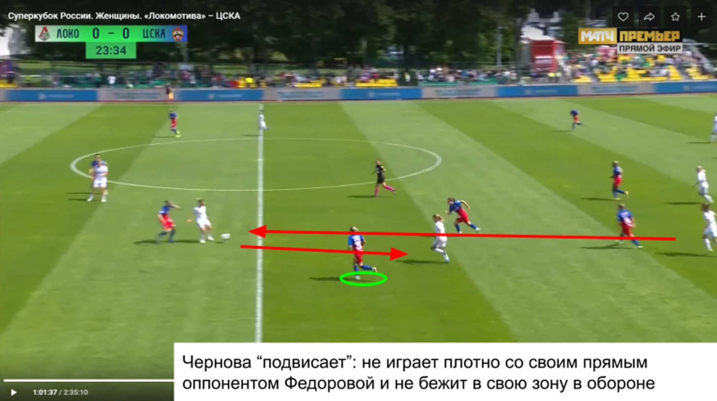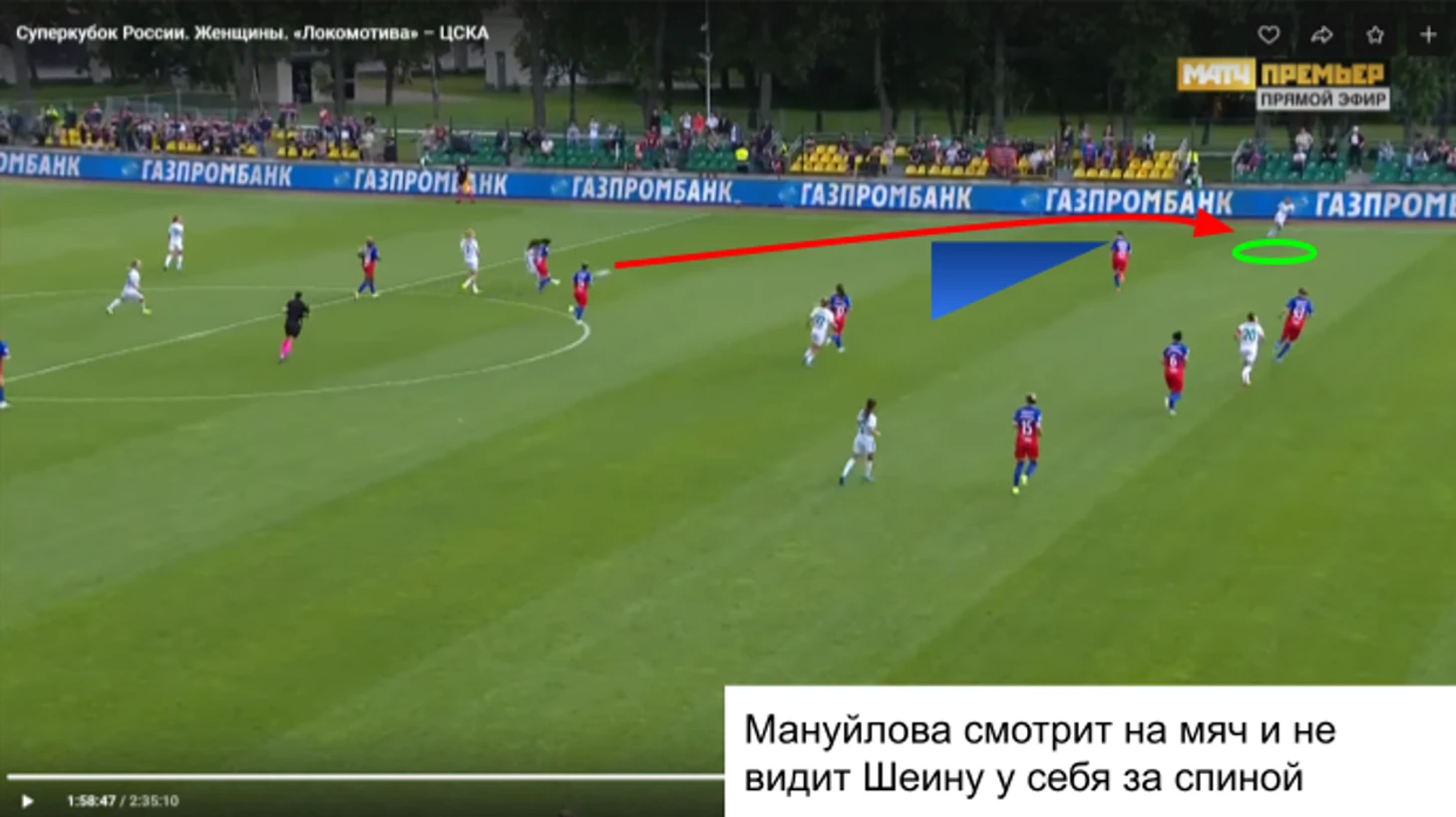 Велик соблазн списать первый гол на невезение ЦСКА: сначала неудачный отскок при отборе, потом падение Черновой и в завершении – удар между ног Тодуа. Однако в самом начале эпизода была допущена тактическая ошибка: Чернова не разобралась, какой из вариантов продолжения атаки закрывать, и в результате Коровкина беспрепятственно получила мяч в зоне за спиной линии защиты.