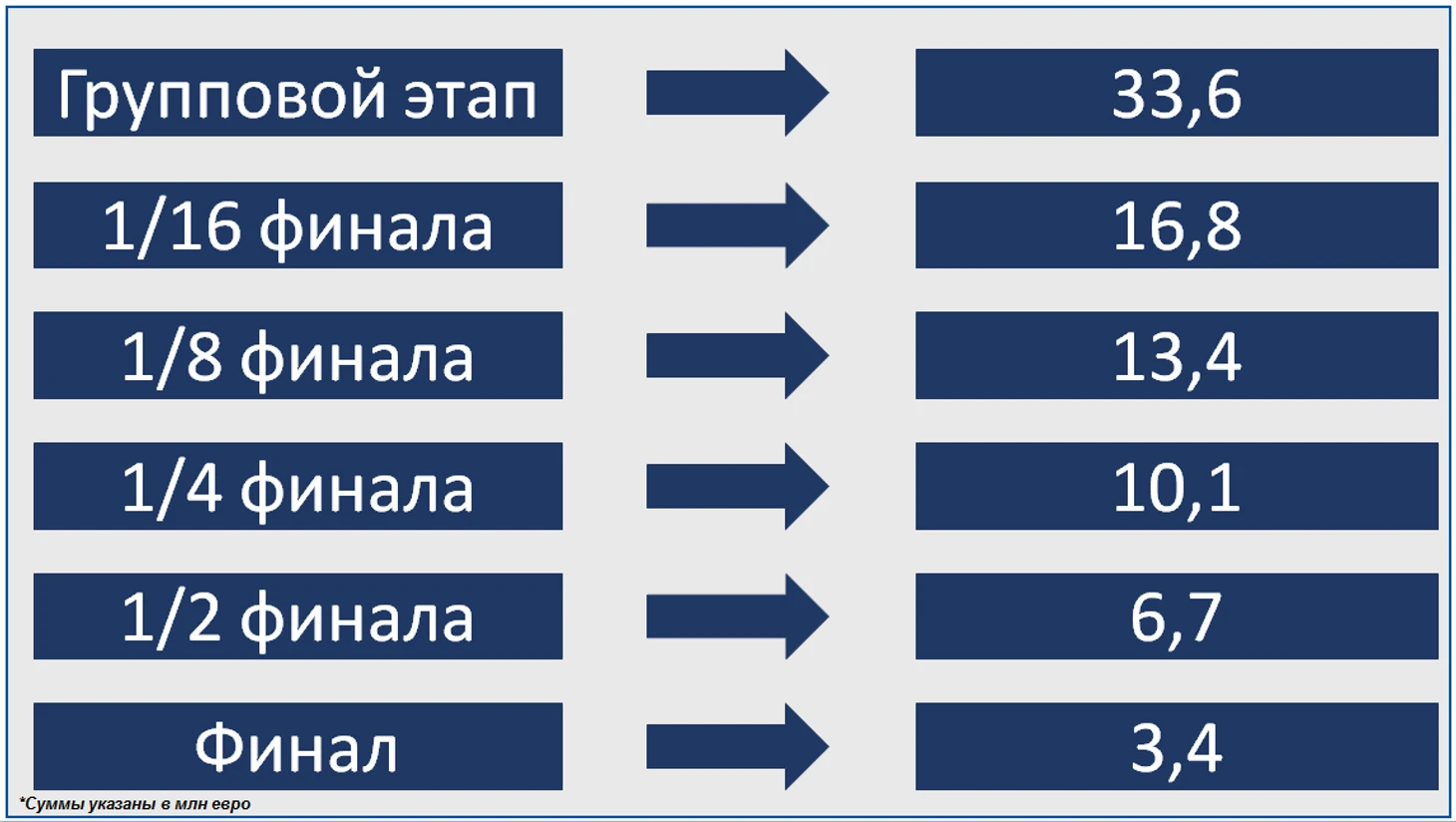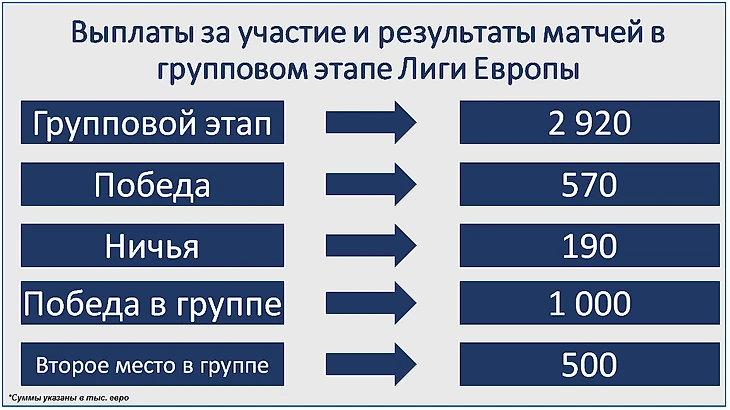 Эта сумма выплачивается за результаты матчей в группе, а также за выход в 1/8 финала ЛЕ и дальнейшее продвижение по сетке турнира. Бонус за каждую победу на групповом этапе составит 570 тыс. евро, за ничью - 190 тыс. Неиспользованные средства (190 тыс. с каждой ничьей) суммируются и перераспределяются среди участников группового этапа в пропорциональной зависимости от количества побед. Кроме того, предусмотрены выплаты за первое и второе место в группе: 1 млн евро и 500 тыс. евро соответственно.