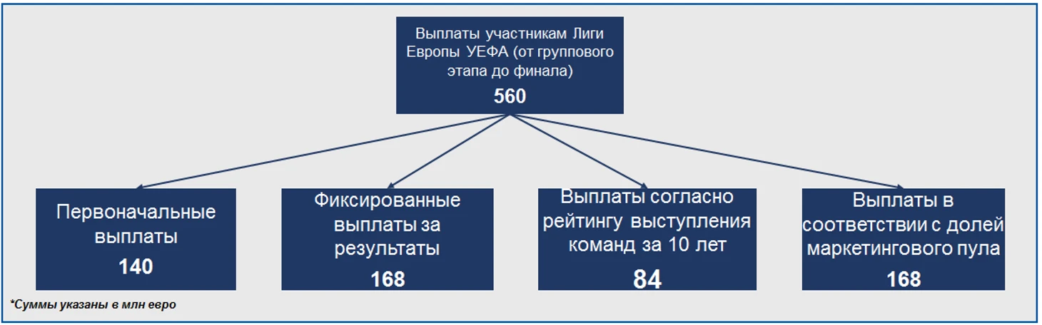 Между участниками Лиги Европы, которые сумели дойти до групповой стадии распределяется 560 млн евро (для сравнения – участникам Лиги Чемпионов идет 2 миллиарда евро). Откуда эти средства берутся и как они распределяются до того как доходят до уровня Лиги Европы подробно описано в предыдущем посте, где описано распределение финансов в ЛЧ, так что можете прочитать (ссылка будет внизу). Также клубы, которые вылетают из квалификации ЛЕ не получает средства из пула Лиги Европы, эти клубы получают выплаты солидарности (об этом тоже немного рассказано в предыдущем посте)