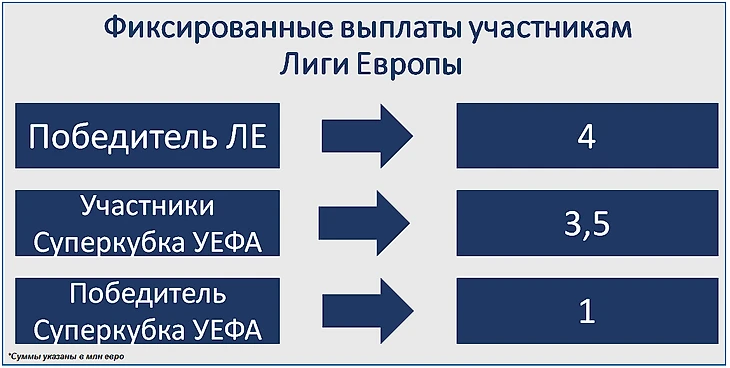 На следующей картинке, также указаны выплаты за участие и победу в Суперкубке УЕФА, эти средства не входят в 560 млн, которые отведены для ЛЕ, эти деньги идут из пула Лиги Чемпионов.