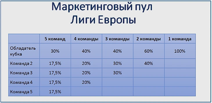 • Если обладатель национального кубка не выходит в групповой этап Лиги Европы, соответствующая сумма из общего маркетингового пула делится поровну между клубами-участниками из данной национальной ассоциации.