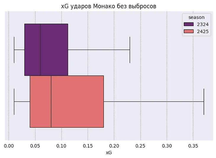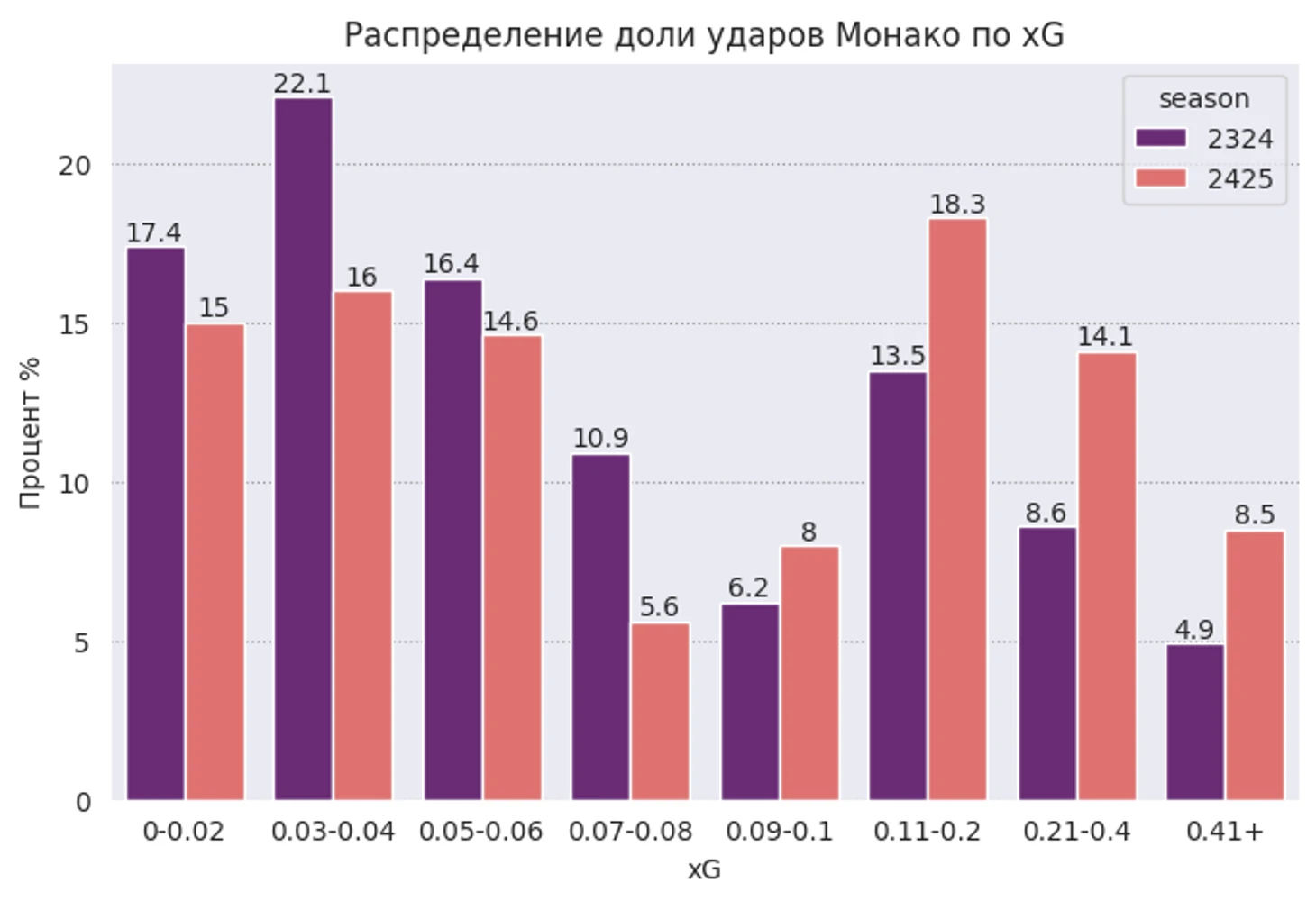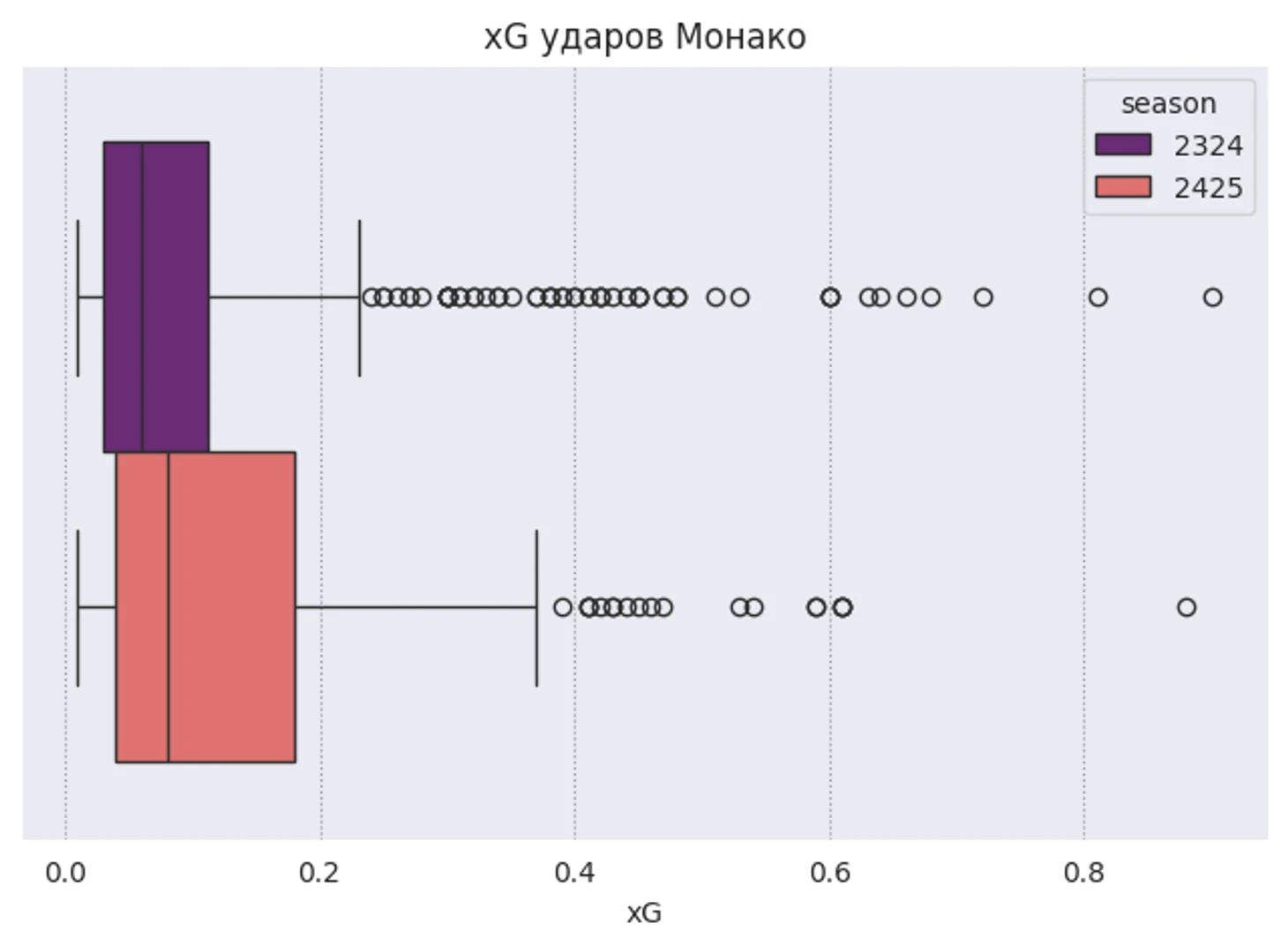 На боксплотах видно, что если в прошлом году основная часть ударов монегасков имела вес в диапазоне 0.3-0.11, то сейчас этот бокс даже захватывает значение в 0.18 xG. Вряд ли он будет таким до конца сезона, у Монако слишком большая доля ударов с качеством выше 0.2 xG, но все равно, изменения очевидны.