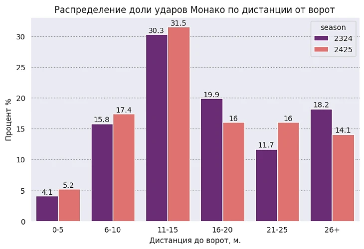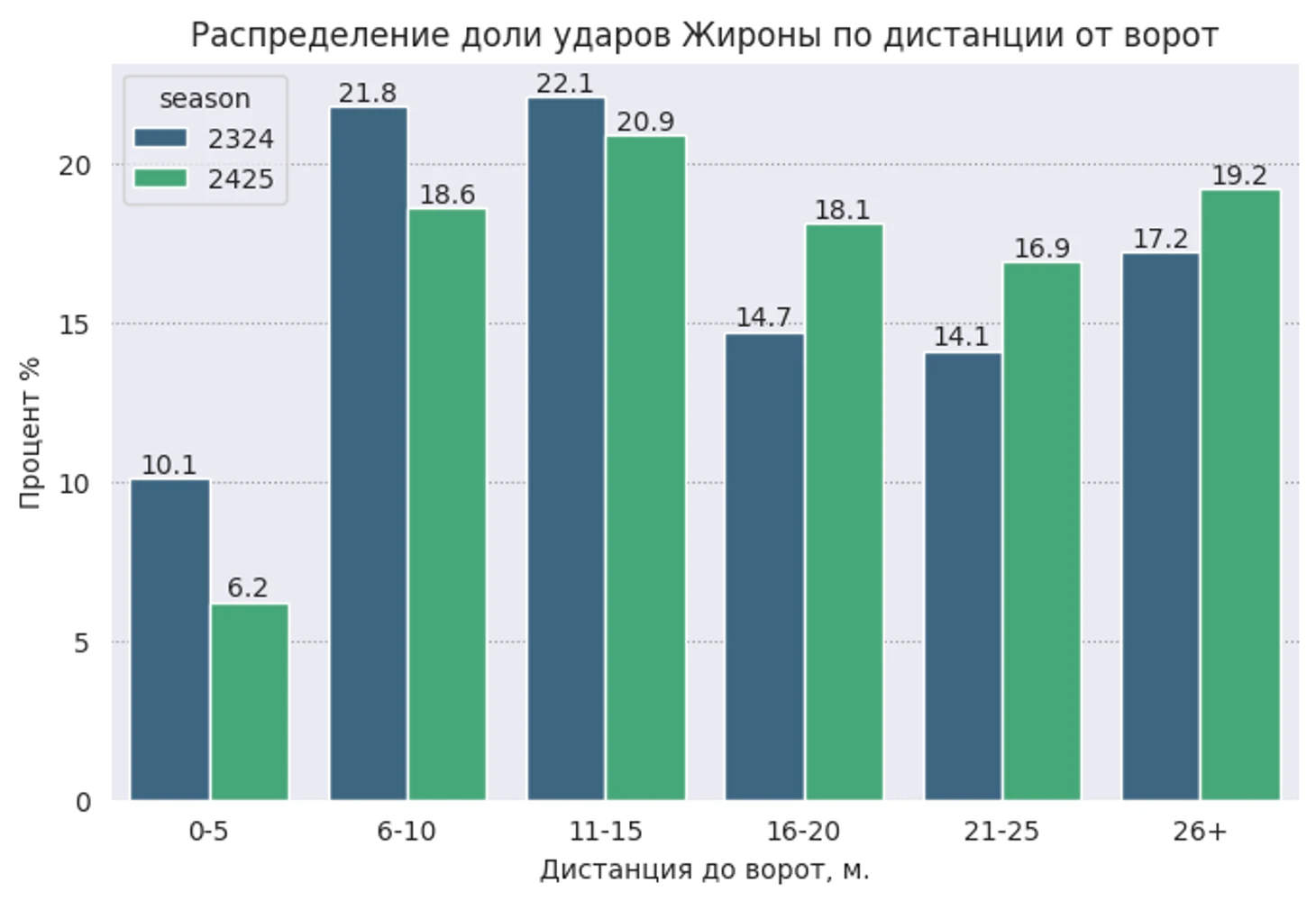 При группировке ударов Жироны по xG видно, что все группы с качеством выше 0.04 xG в этом сезоне уменьшили свою долю. Зато удары с весом 0.04 xG и меньше теперь занимают более 50% объема всех ударов испанцев. Величина xG имеет обратную корреляцию с дистанцией ударов, и действительно, средняя дистанция ударов Жироны в этом сезоне выросла на 1 метр 30 сантиметров. Заметьте, что самая близкая зона, с дистанцией до 5 метров, уменьшилась в доле почти в два раза. Можно сказать, что у Жироны не получается доставлять мяч в опасные зоны и наносить из них удары с такой же частотой, как в сезоне прошлом.