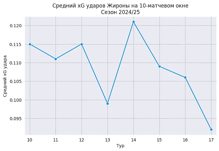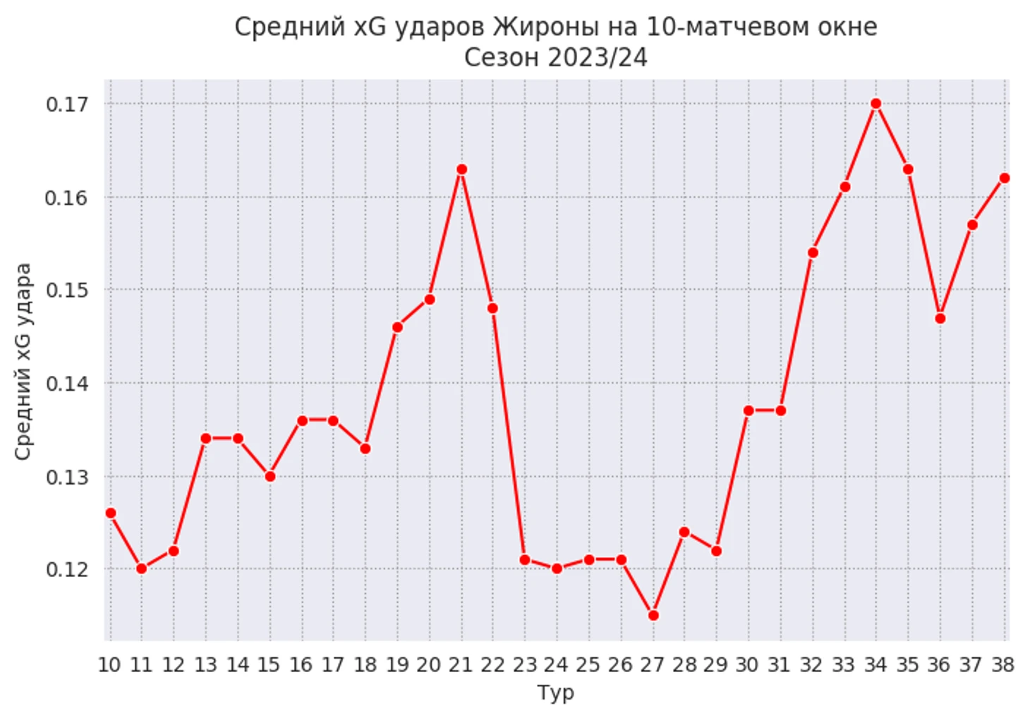 Если кратко: это не так. У меня была гипотеза, что во второй части прошлого чемпионата, когда к Жироне уже стали относиться как к команде топ-уровня, они стали терять в качестве ударов и нынешний год просто является продолжением тренда. Но если посмотреть на 10-матчевое окно игр, то наилучший средний xG ударов у Жироны был с 25 по 34 туры. Да и в целом, только раз за весь турнир показатель упал ниже отметки 0.12. В этом году он лишь раз оказался этой отметки выше.