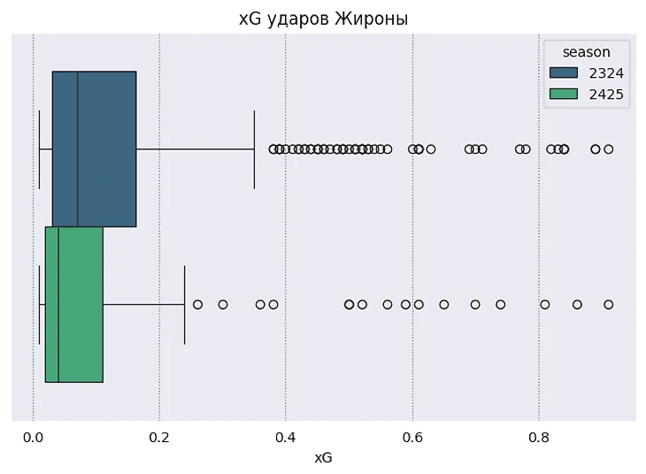 На боксплотах хорошо заметно, что во-первых, даже с учетом того, что сыграно меньше половины игр, у Жироны уменьшилось число ударов с очень высоким xG (точки на первом графике), а во-вторых основная их часть имеет xG меньше одной десятой. Жирона потеряла три сотых (это много) и по среднему, и по медиане.