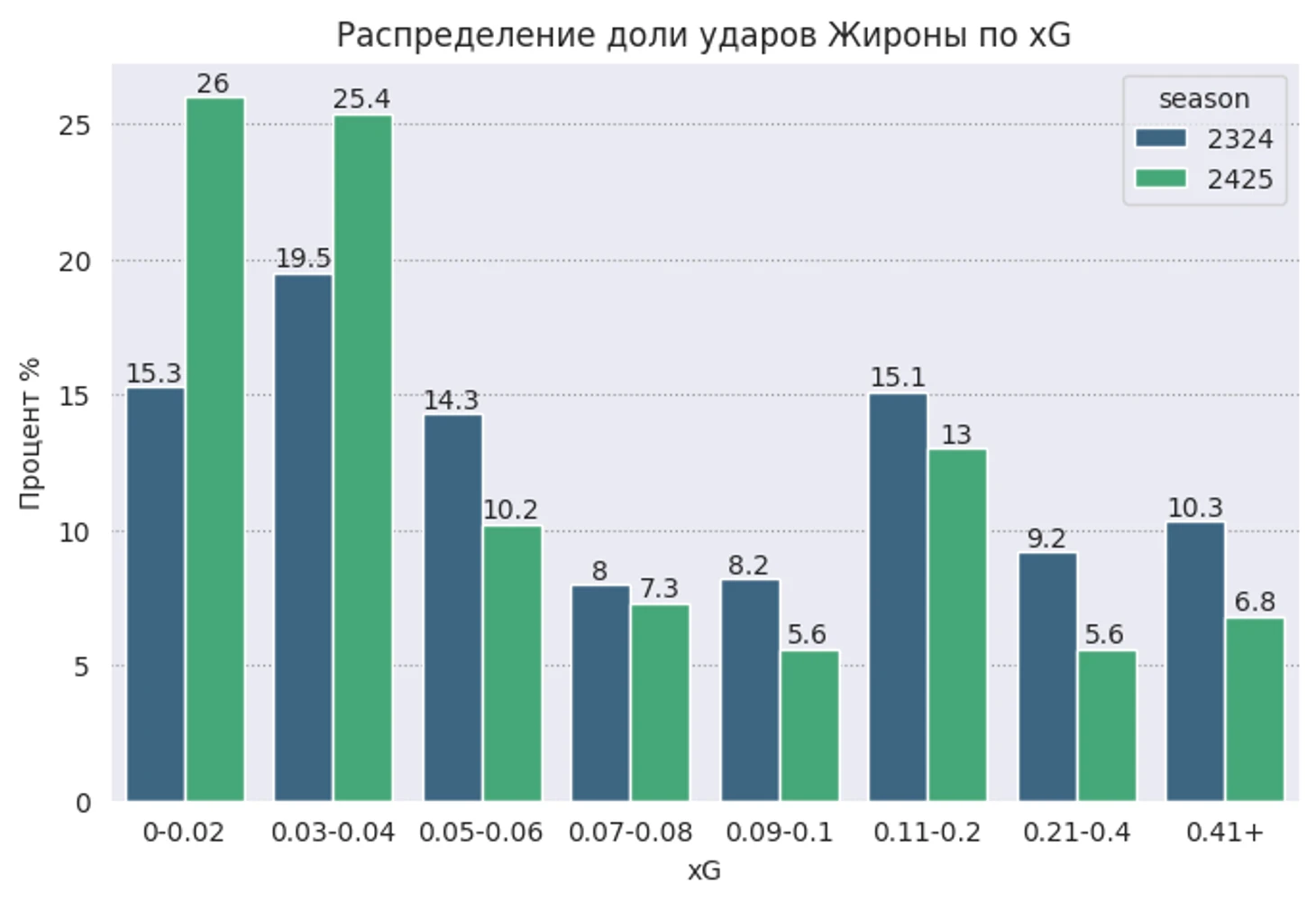 Летом Жирона потеряла несколько ключевых игроков. Четверка ушедших игроков (Довбик, Алеиш Гарсия, Коуто, Савиньо) участвовала (удары или предударное действие) в 75% ударов Жироны в прошлом сезоне. Такое влияние сложно заменить, тем более когда ты не обладаешь большими трасферными возможностями. Отдельно стоит сказать про Довбика. Его средний xG ударов в прошлом году 0.23. Это много. Понятно, что в этом заслуга не только Артема, но умение оказаться/открыться в нужное время в нужном месте нападающего важный фактор в таких цифрах.