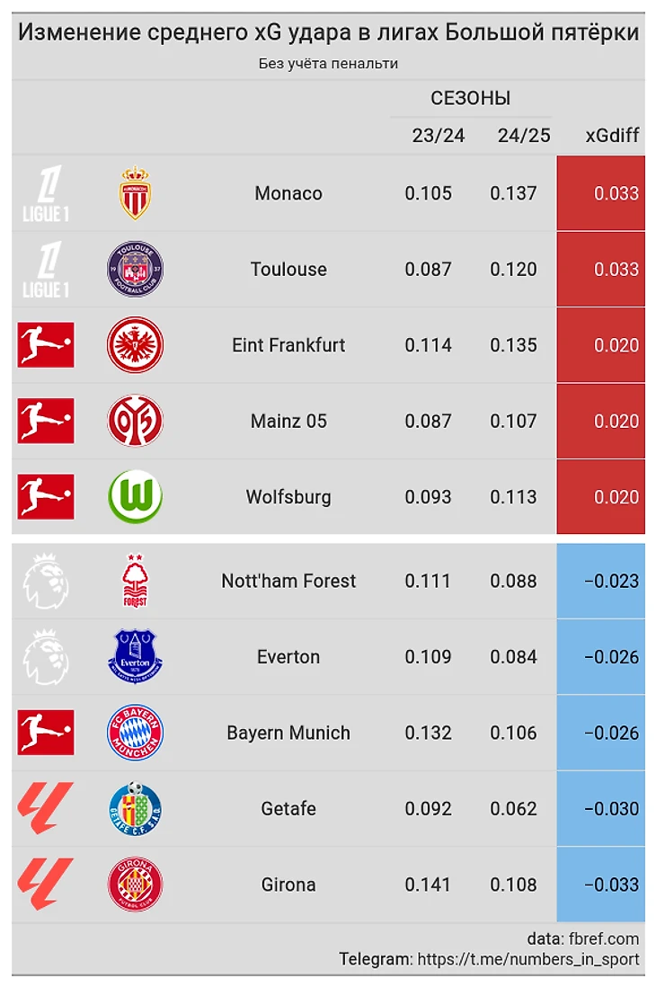 В таблице ниже представлены топ-5 и боттом-5 команды по изменению xG удара в двух сезонах. Я написал небольшой пост в своем тг-канале «Цифры в спорте» (буду рад новым подписчикам!) с саммари результатов. Там я отметил некоторые моменты для всех команд, кроме Монако и Жироны.