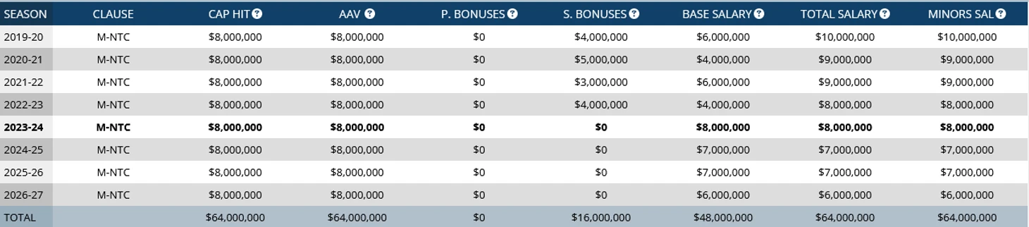 Как можно понять, Кутюра устраивает положение дел в команде и жертвовать жизнью в Калифорнии, ради кубковых амбиций он не собирается. Касательно его действующего 8-летнего контракта, то в нём есть модифицированный NTC, означающий, что Кутюра есть возможность предоставить список из трёх команд, куда его могут обменять. Это сильно осложняет работу Майку Гриру по поиску возможных вариантов для обмена. Бонусом идёт его большой кэп-хит в размере 8 млн. который будет висеть до окончания сезона 2026/2027. По этой причине многие команды столкнутся с трудностями при попытке вписать такой контракт в свою платёжку. Без удержания части кэп-хита здесь не обойтись, у акул как раз осталось одно свободно место, после ретеншенов Бёрнса и Карлссона. Сан-Хосе придётся удержать в своей платёжной ведомости порядка 2,775 - 3,0 млн, чтобы трейд состоялся. В свою очередь Грир по максимуму будет стараться сторговаться на меньшую сумму, как в случае с обменом Карлссона, что сильно отразиться на компенсации.