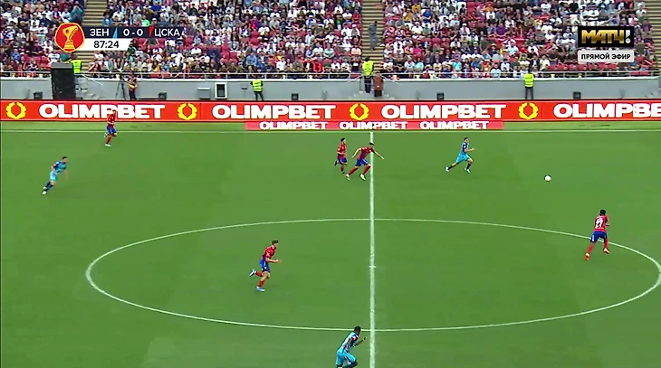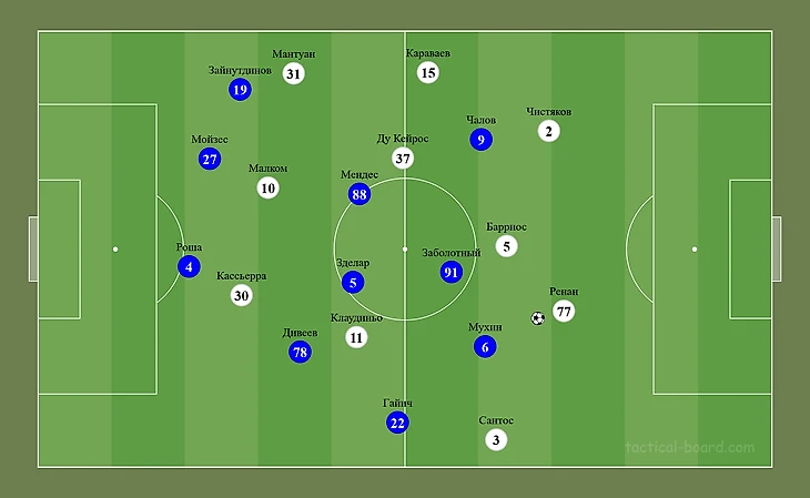 В таких ситуациях Клаудиньо часто опускался в глубину, а за ним смело выдвигался Дивеев. Семак планировал пользоваться свободным пространством за спиной крайних центральных защитников, поэтому Ренан и Сантос регулярно искали средними и длинными передачами Кассьерру или Малкома в этой зоне.