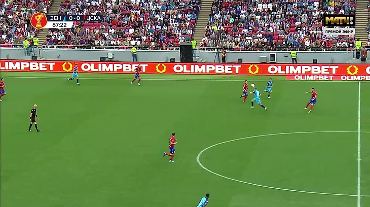 Во втором тайме «Зенит» начал активнее использовать правый фланг и во время розыгрышей Ду Кейрос с Барриосом стали чаще меняться местами. Иногда даже Клаудиньо оказывался на позиции разыгрывающего опорника. Игроки ЦСКА всё ещё действовали персонально, поэтому частые смены позиций помогали освобождаться кому-то из центральной тройки полузащитников «Зенита». В этот период команда Семака стала лучше двигать мяч и казалось, что второй тайм проведёт на уровне прошлого сезона.